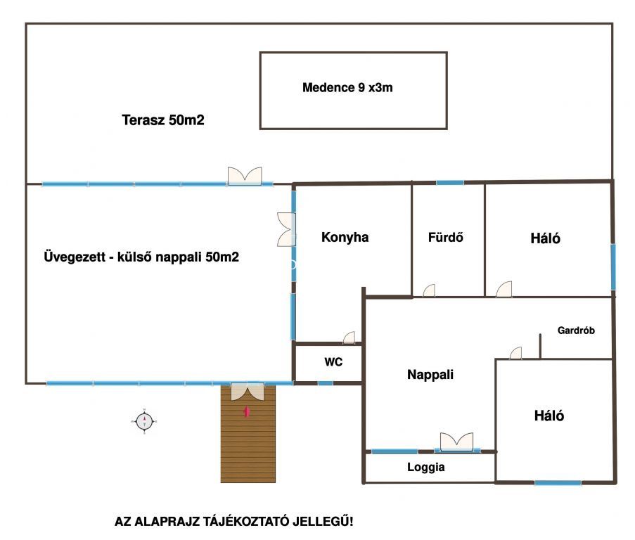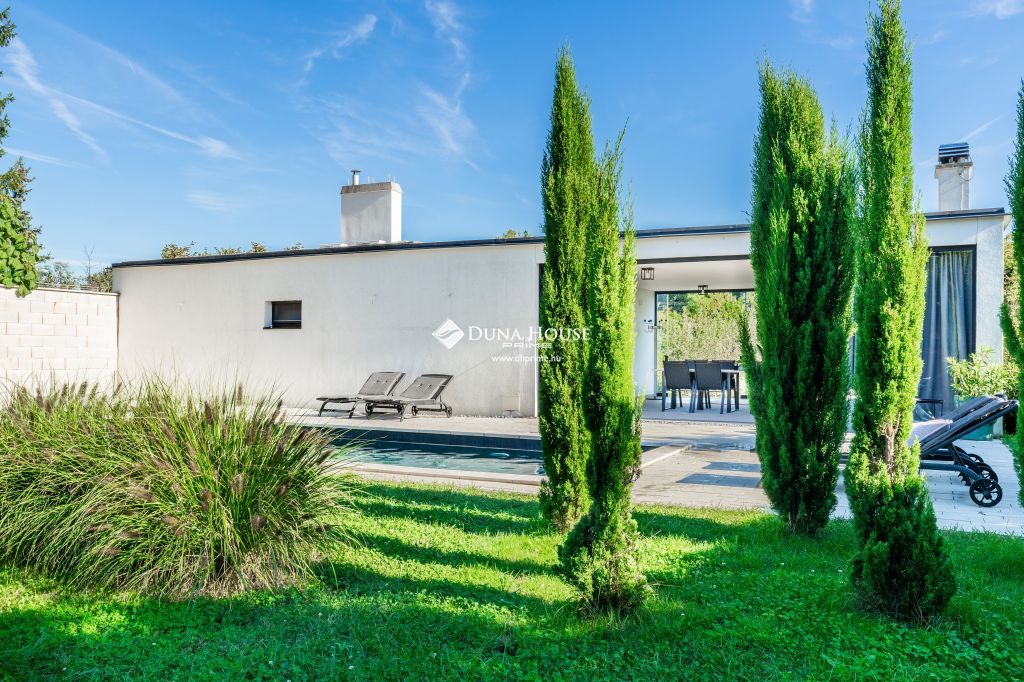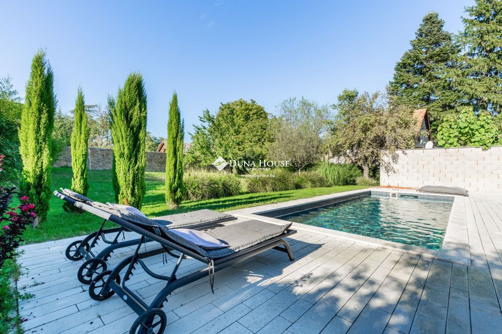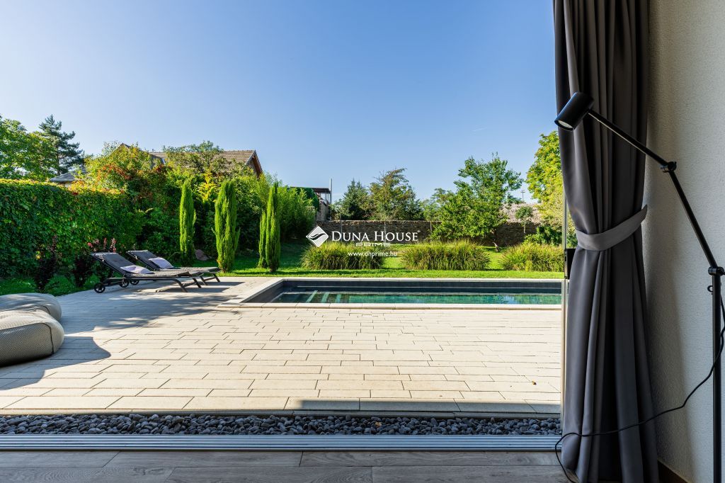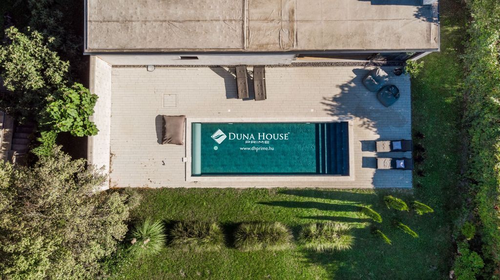 A felső szinten három hálószoba, egy modern konyha, vendég-WC és fürdőszoba kapott helyet. Innen nyílik egy 50 m²-es napozóterasz, amely körbeölel egy 9x3 méteres, fűthető, ellenáramoltatós medencét tökéletes pihenésre és feltöltődésre.