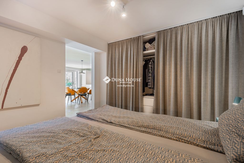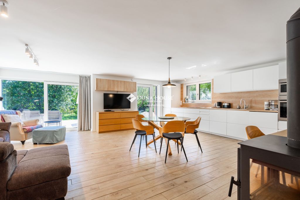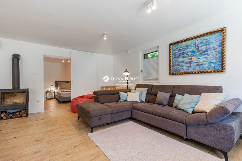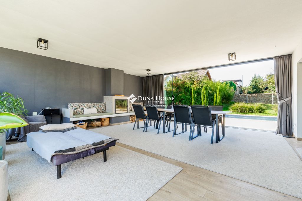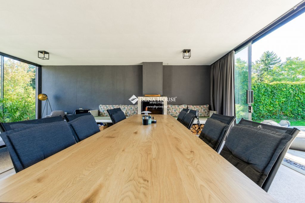 A hatalmas, üvegfelületekkel borított 50m2-es nappali a ház központi tere, ahol az üvegtolóajtók révén a belső tér szinte eggyé válik a kerttel. A nappaliban kandalló is található, amely meghitt hangulatot teremt a hűvösebb estéken.