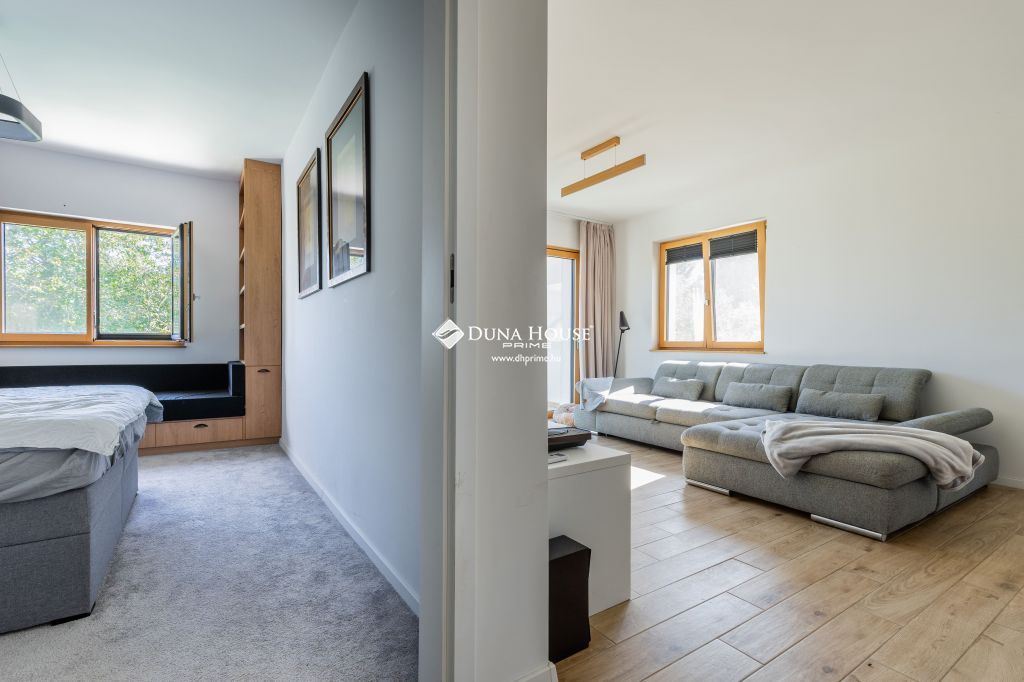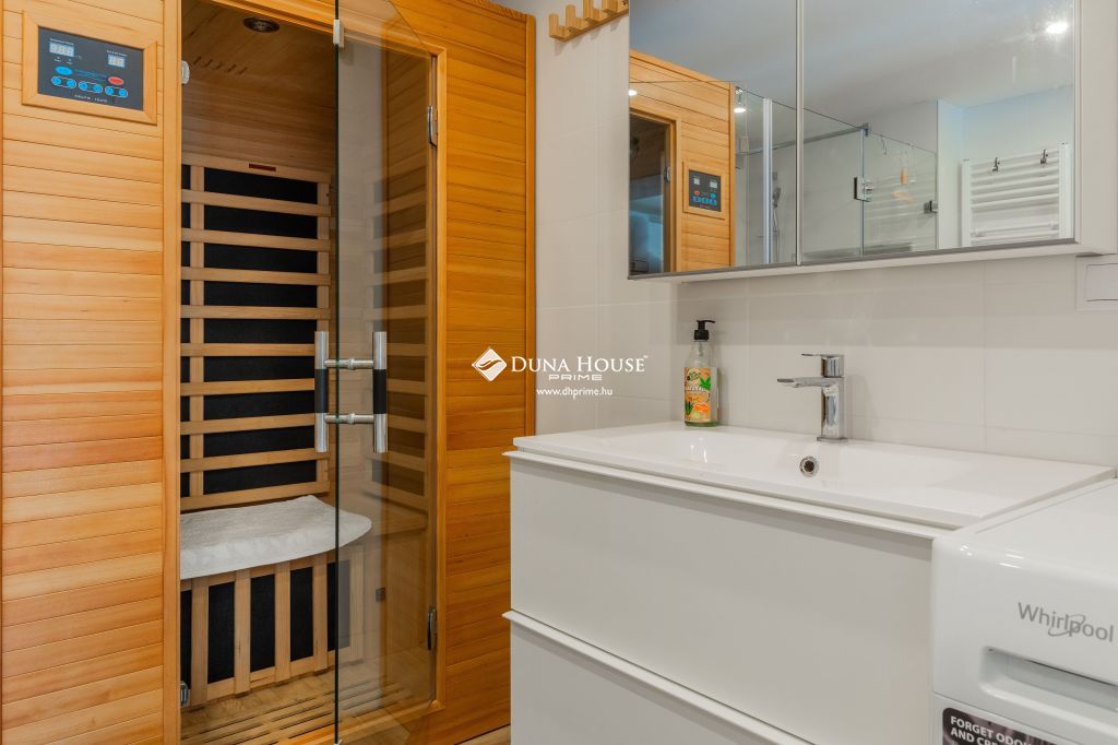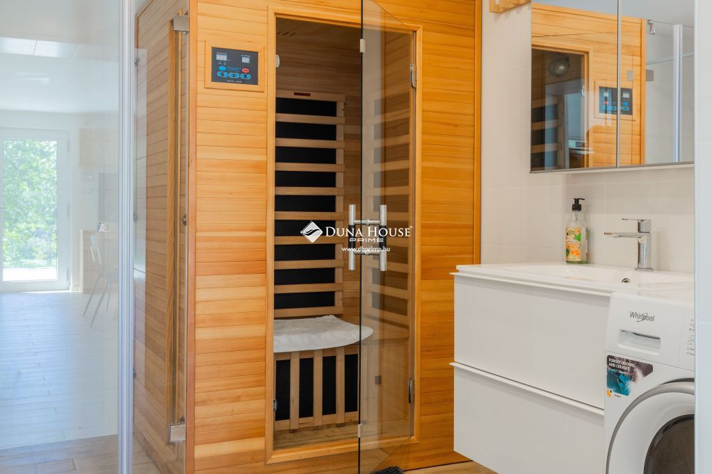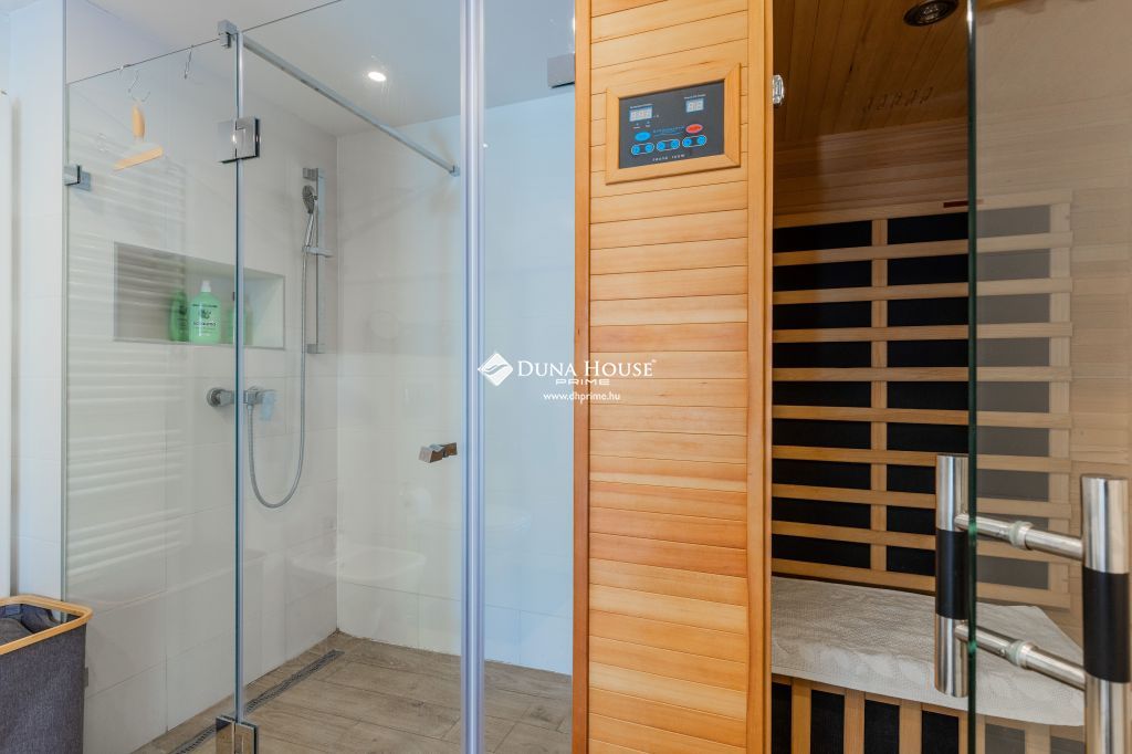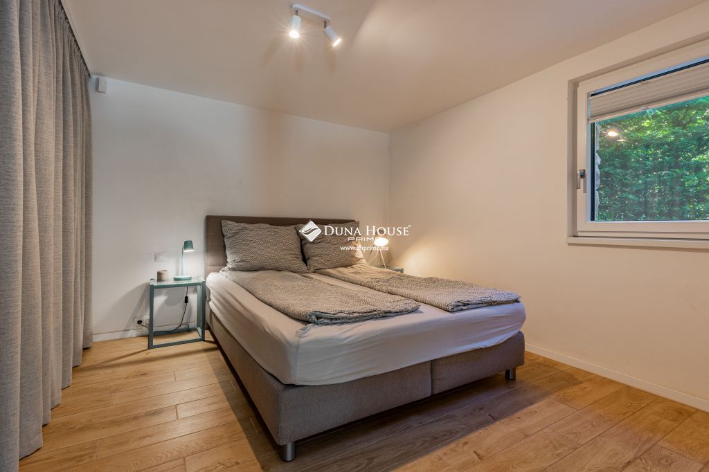 A külön szinteltolásban elhelyezkedő alsó szint, amely 60m2, akár önálló lakrészként is használható, így ideális kétgenerációs családok számára. Itt egy amerikai konyhás nappali, hálószoba, fürdőszoba szaunával, bidével, valamint egy nagy 40m2-es terasz található.