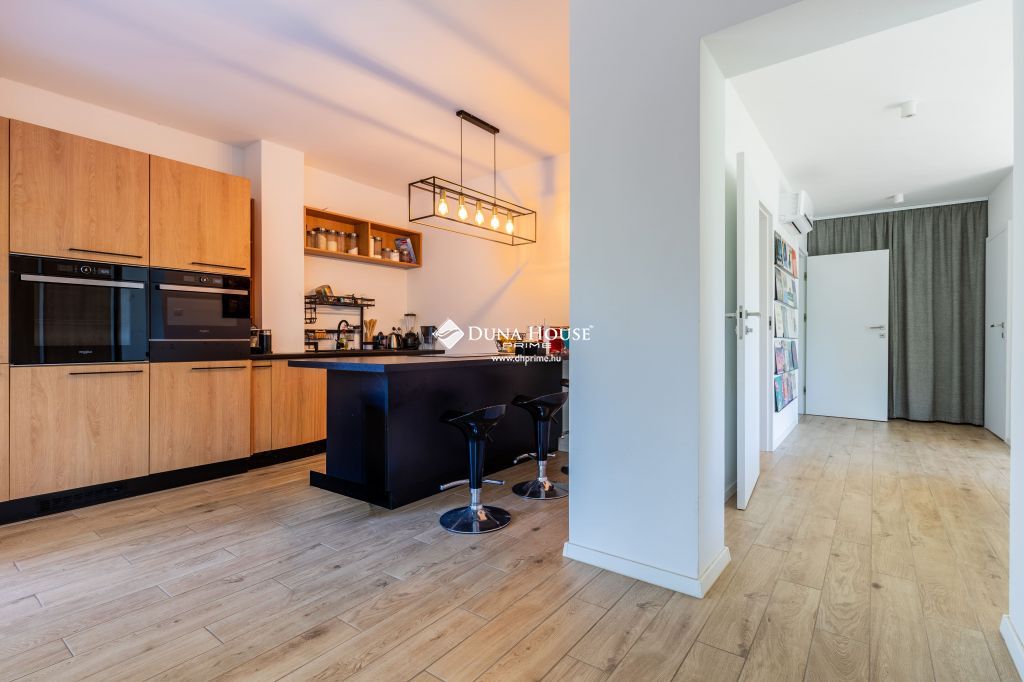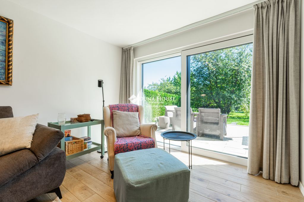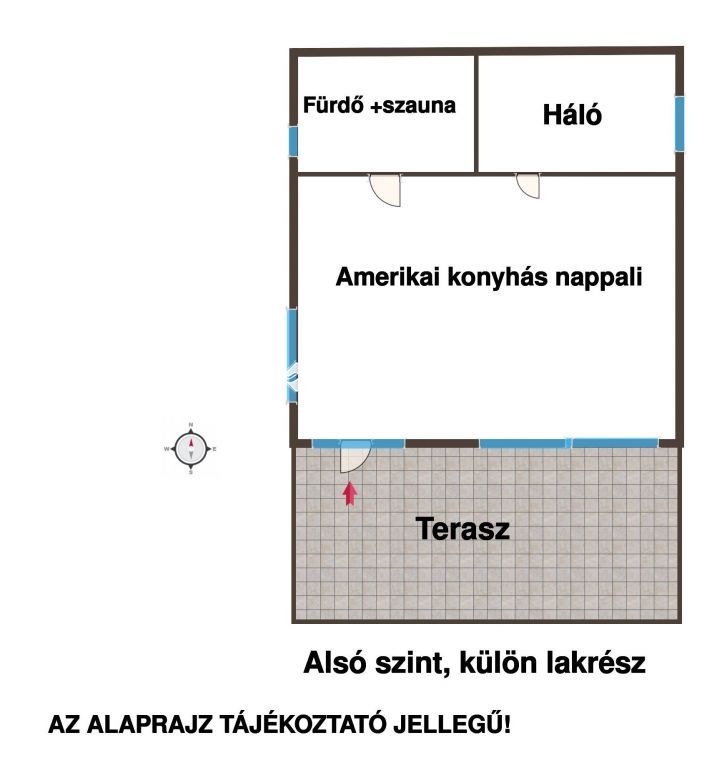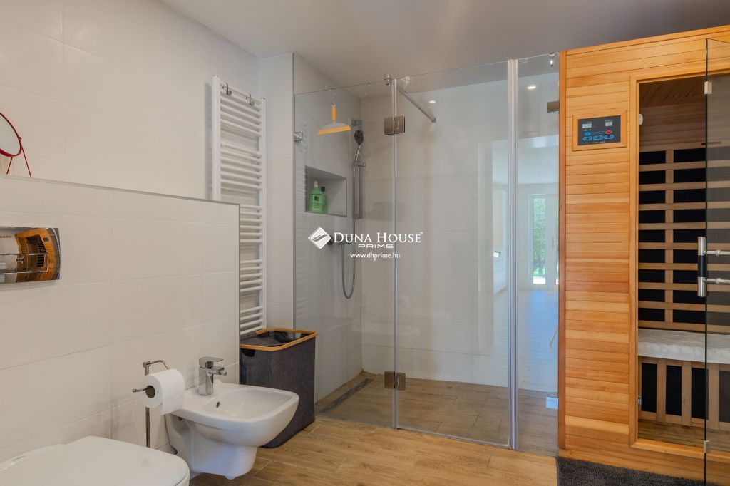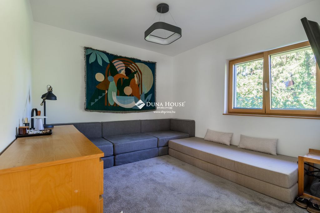 A külön szinteltolásban elhelyezkedő alsó szint, amely 60m2, akár önálló lakrészként is használható, így ideális kétgenerációs családok számára. Itt egy amerikai konyhás nappali, hálószoba, fürdőszoba szaunával, bidével, valamint egy nagy 40m2-es terasz található.
