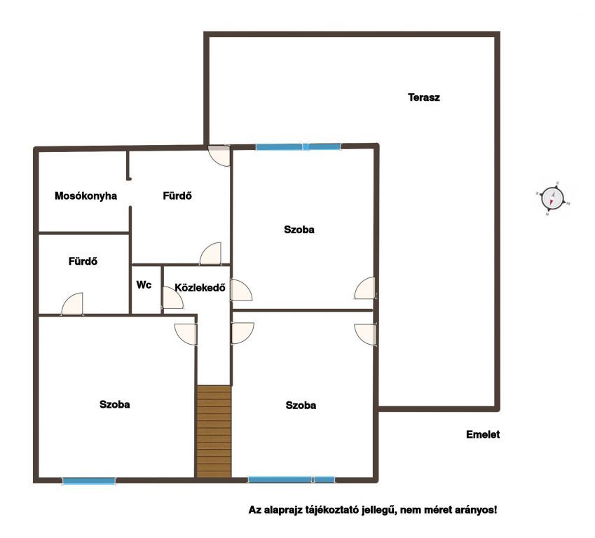 A szobákból és a fürdőből is kijárat nyílik a panorámás teraszra, amely a ház egyik legkülönlegesebb pontja. A lépcső széles, világos, külön ablakkal ellátott, ami barátságos hangulatot kölcsönöz a közlekedőnek.
