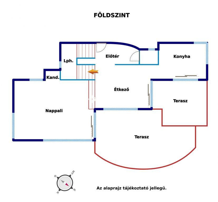 - Földszint: tágas nappaliétkezőkonyha egyben, mégis szeparálva, hatalmas üvegfelületekkel és lenyűgöző kilátással a díszkertre; innen nyílik a fedett és nyitott terasz