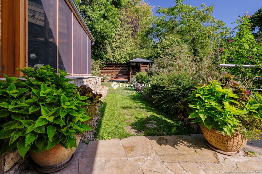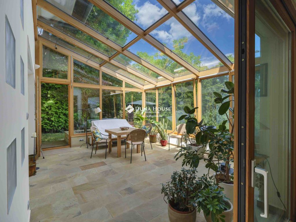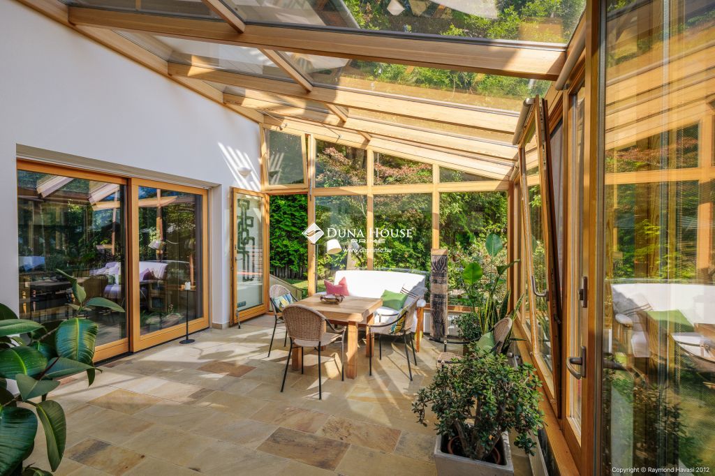 A házat körülölelő gondozott díszkert, a nagy üvegfelületeken át beáramló fény, valamint a teraszok és a télikert minden évszakban különleges atmoszférát teremtenek.