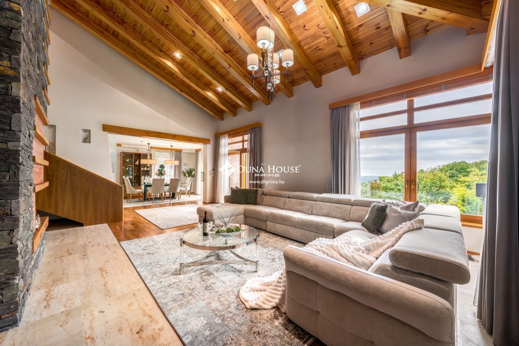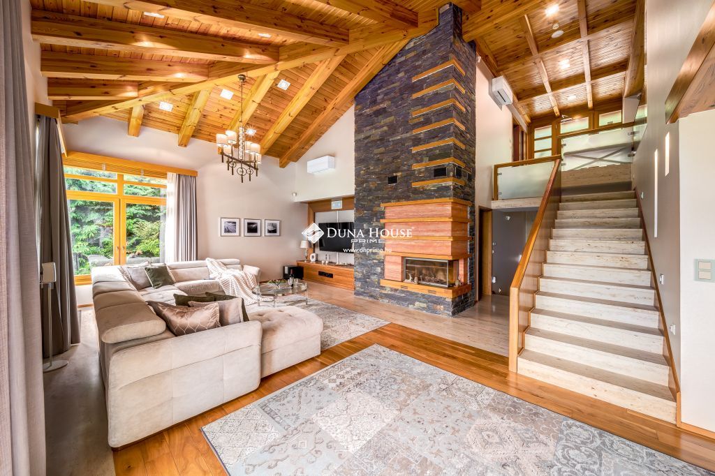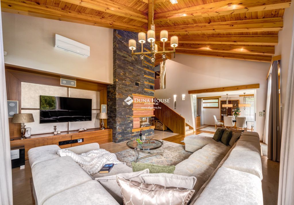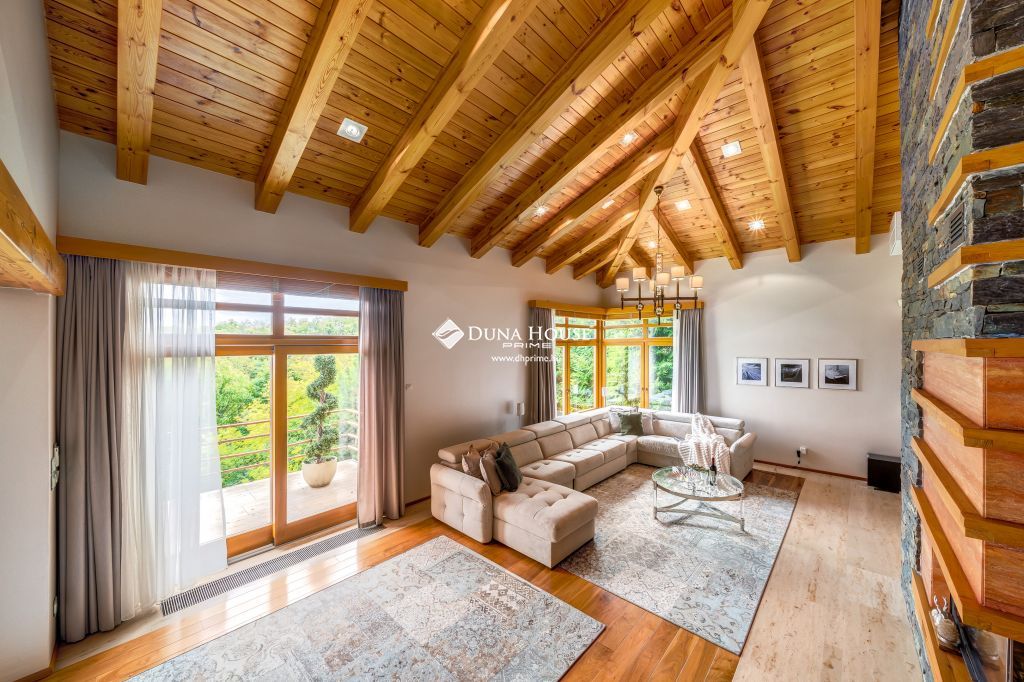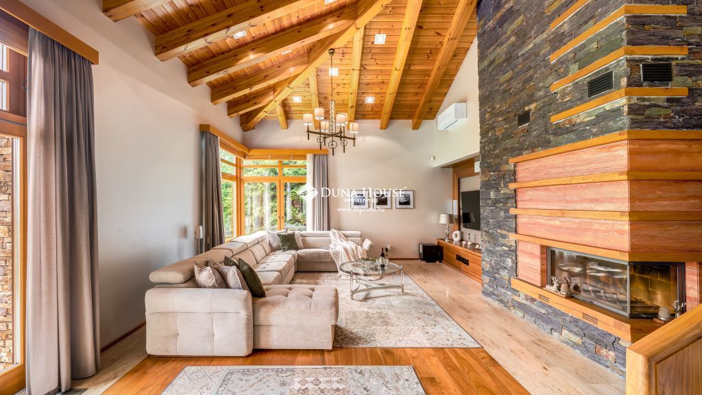 A ház szíve a tágas nappali, amelyet több mint 5 méteres belmagasság, elegáns kandalló és a lenyűgöző, örökpanorámás kilátás tesz igazán egyedivé.