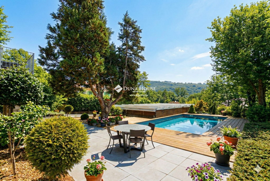 Telek: 2045 m²-es, elnyújtott privát telek, melynek köszönhetően a villa az utcától távol, teljes csendben és intimitásban helyezkedik el.