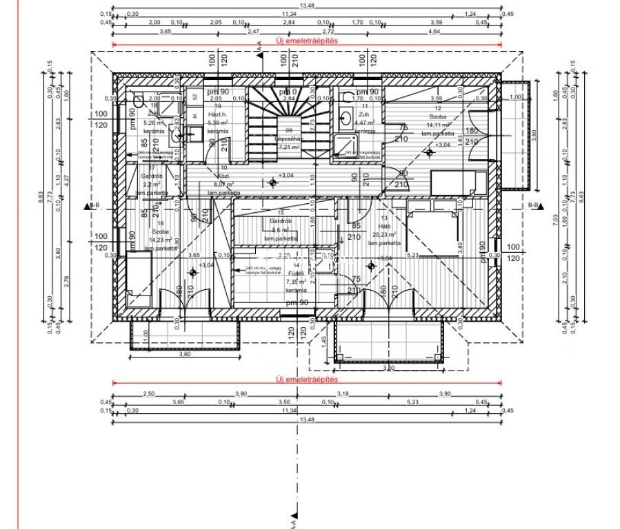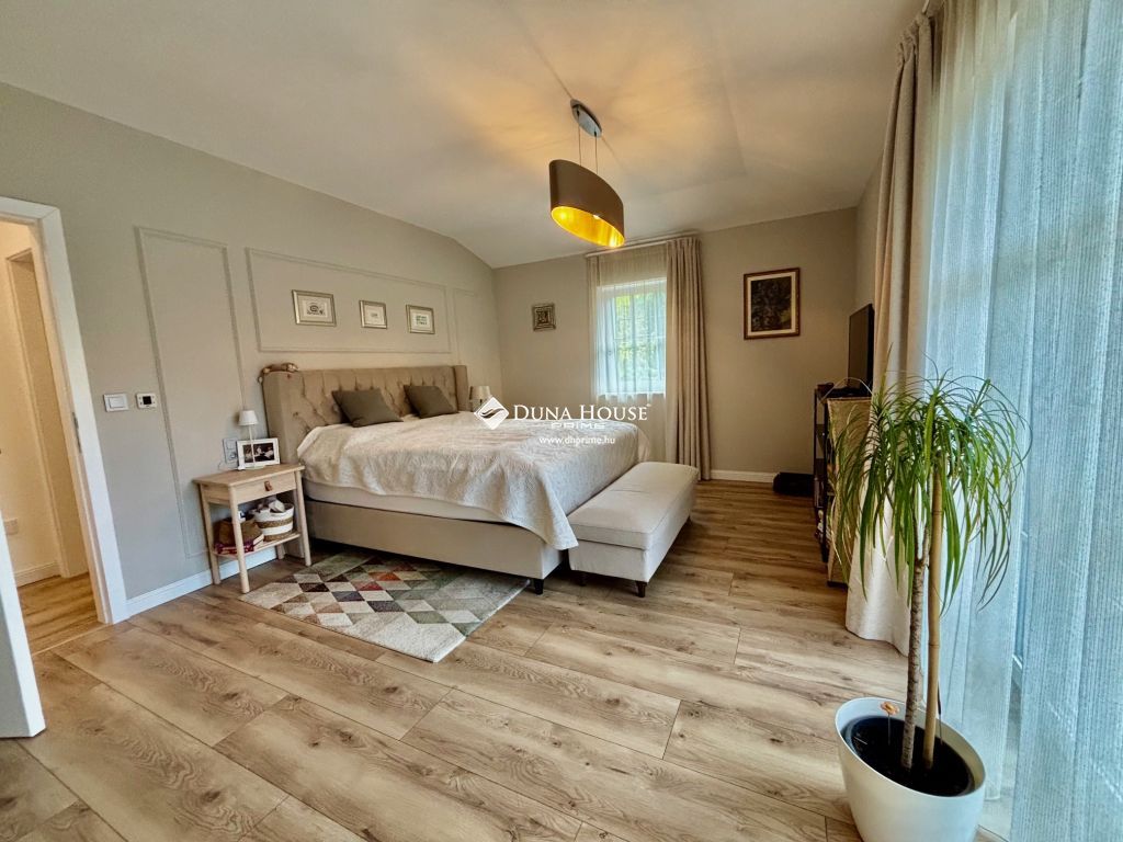 Az emeletre egy impozáns lépcső vezet, ahol három erkélyes hálószoba található, mindegyikhez saját fürdőszoba és WC tartozik, két hálószobához pedig külön gardróbszoba is kapcsolódik. Ezen kívül itt kapott helyet egy mosókonyha/háztartási helyiség és egy közlekedő is.
