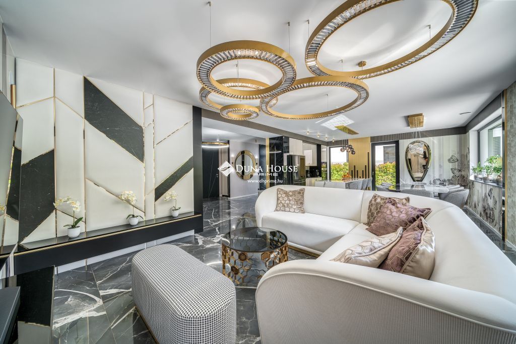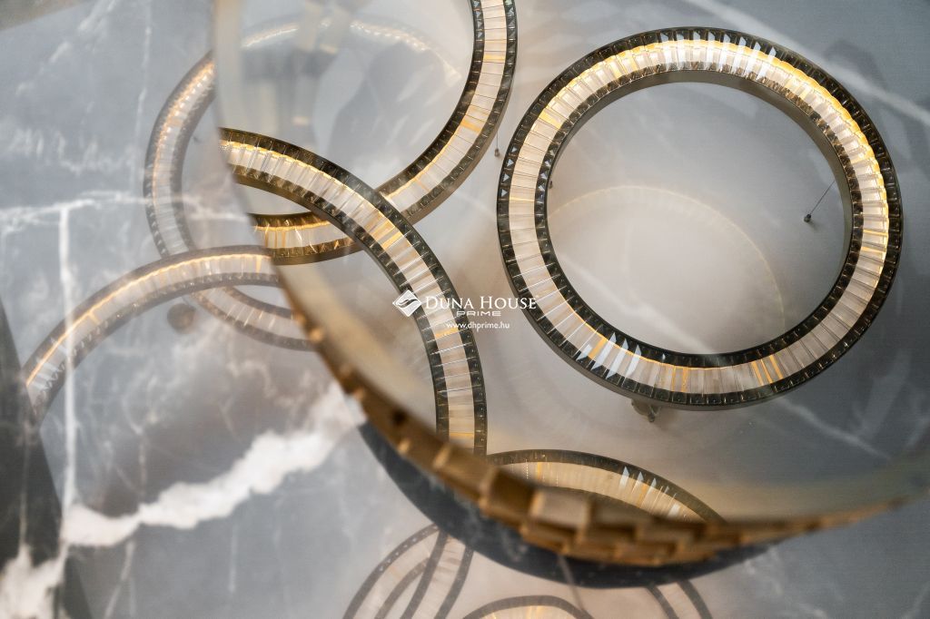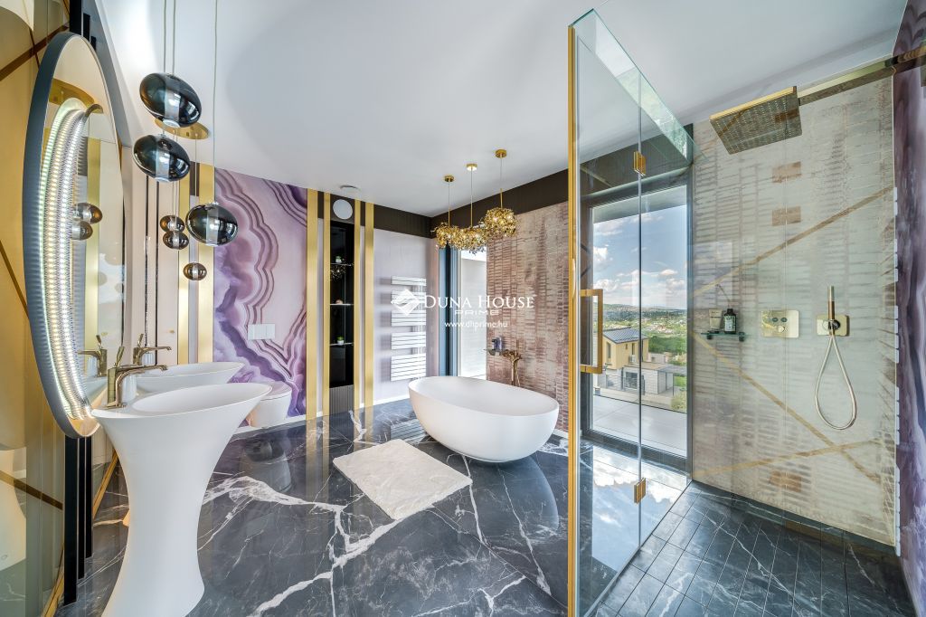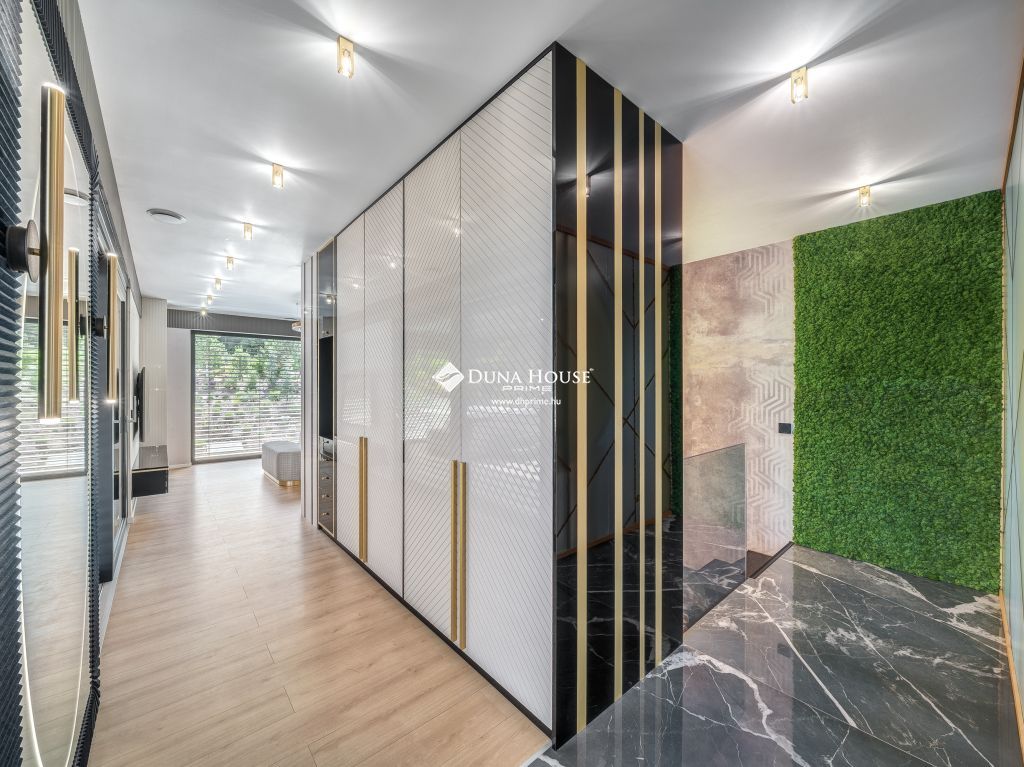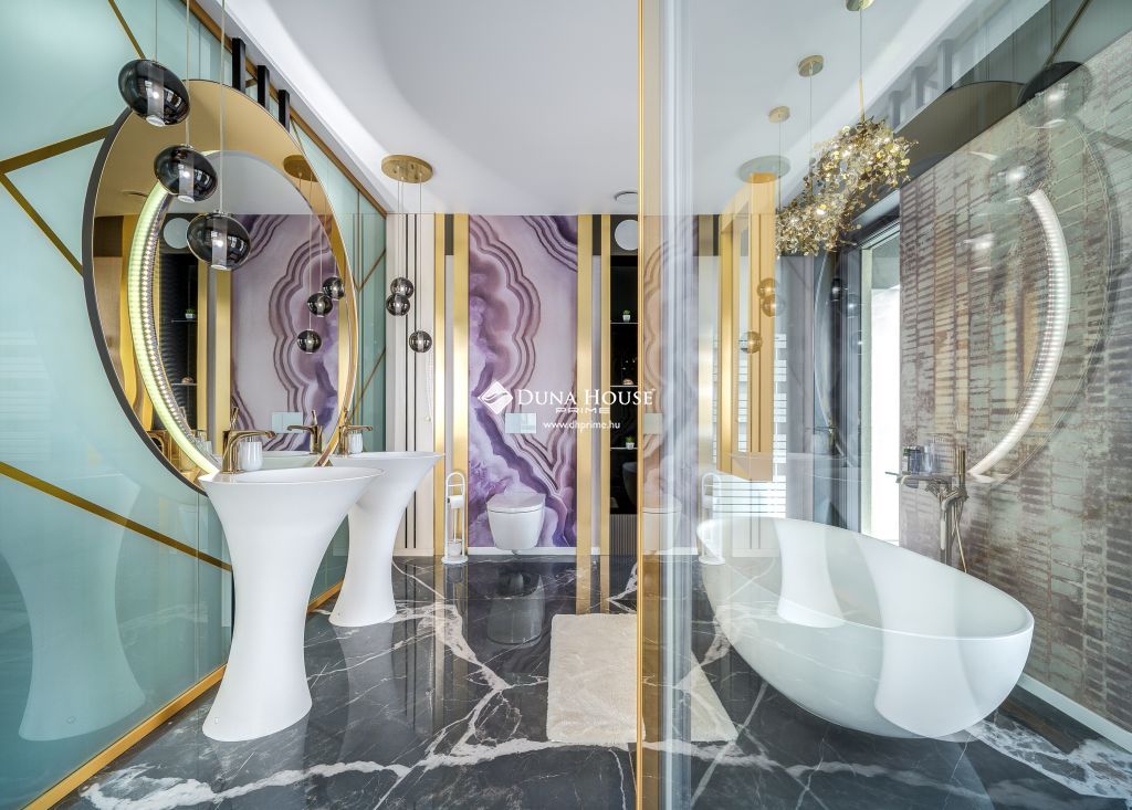 Az ingatlan magas minőségű, exkluzív belsőépítészeti megoldásokkal rendelkezik. Az ArtDeco stílus jegyeit felölelve az arany, a bézs, az antracit és a lila árnyalatai teszik izgalmassá és egyedivé a ház teljes arculatát. A prémium kategóriás olaszországi hideg- és melegburkolatok mellett egyedi gyártású kép- és faltapéták, SICIS festett üveg faldekorok, Art Deco stílusú falpanelek, élő izlandi zuzmóból álló zuzmófalak varázsolják jellegzetessé és harmonikussá a ház belső kisugárzását. Az ingatlan belsőépítészeti megoldásai a legnagyobb luxus és exkluzivitás életérzését adják az ott élőknek: