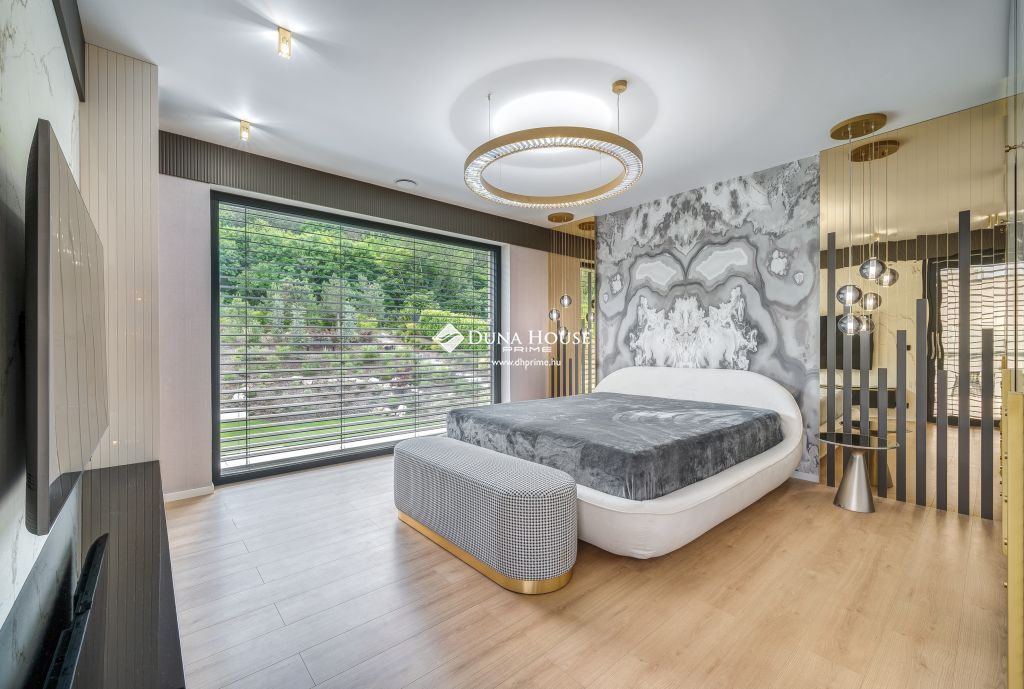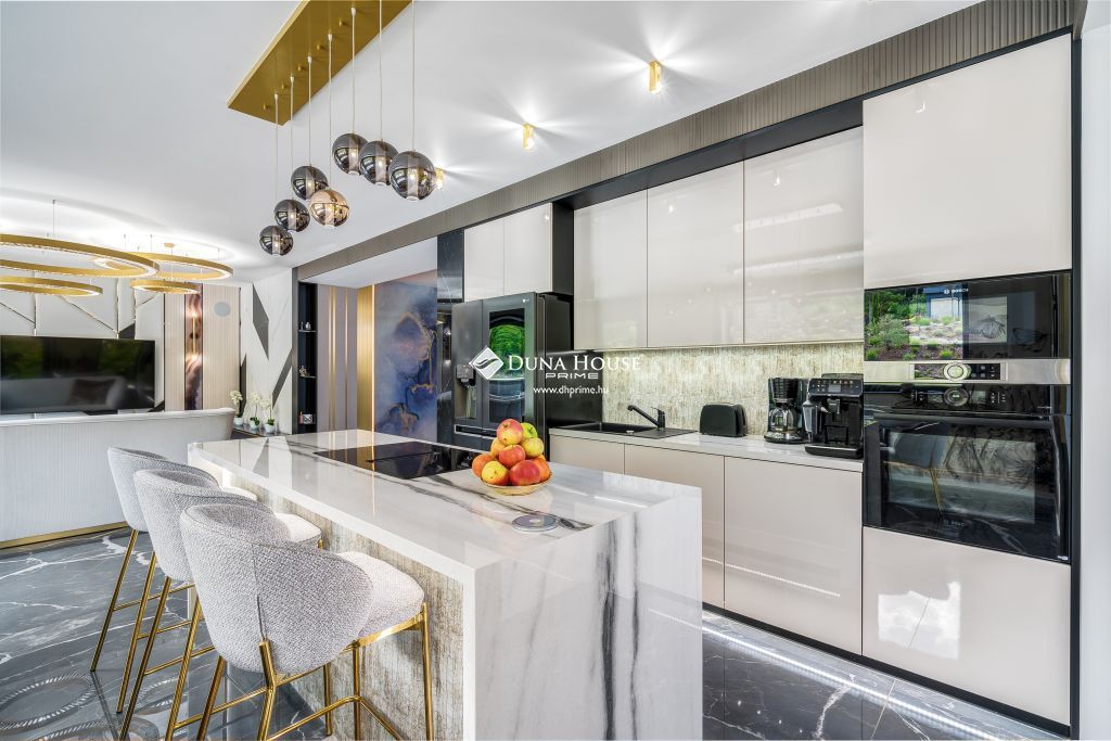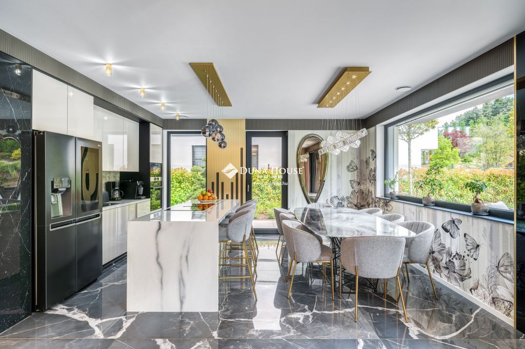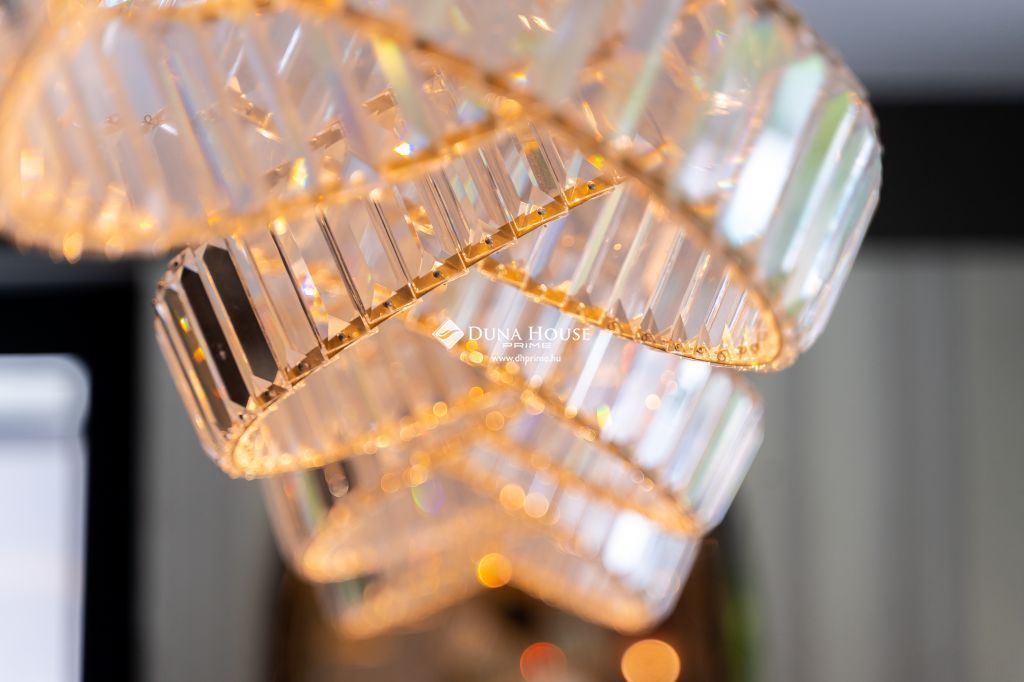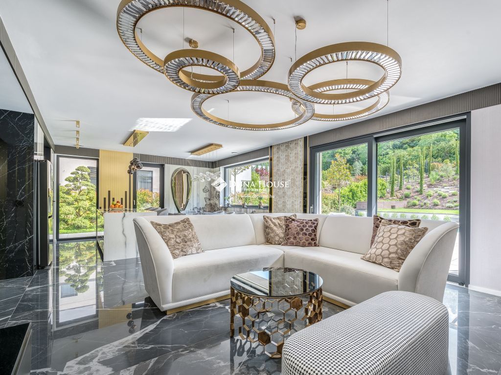 Az ingatlan magas minőségű, exkluzív belsőépítészeti megoldásokkal rendelkezik. Az ArtDeco stílus jegyeit felölelve az arany, a bézs, az antracit és a lila árnyalatai teszik izgalmassá és egyedivé a ház teljes arculatát. A prémium kategóriás olaszországi hideg- és melegburkolatok mellett egyedi gyártású kép- és faltapéták, SICIS festett üveg faldekorok, Art Deco stílusú falpanelek, élő izlandi zuzmóból álló zuzmófalak varázsolják jellegzetessé és harmonikussá a ház belső kisugárzását. Az ingatlan belsőépítészeti megoldásai a legnagyobb luxus és exkluzivitás életérzését adják az ott élőknek:
