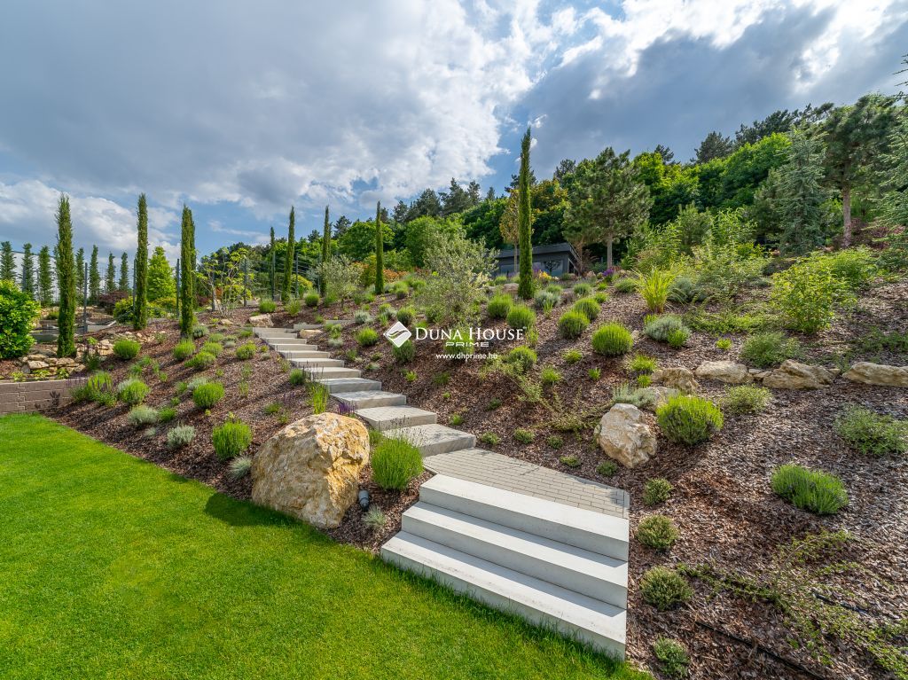 - az ingatlan kertjének tervezése során kiemelt szempont volt, hogy az ingatlan egyedi és innovatív belső megjelenéséhez egy páratlan, mediterrán- és örökzöld növényfajokban gazdag kert is párosuljon. A kiépített öntözőrendszer működtetésével a növények a hazai éghajlati viszonyokhoz alkalmazkodva egész évben változatos színekben, illatokban és formákban pompáznak.