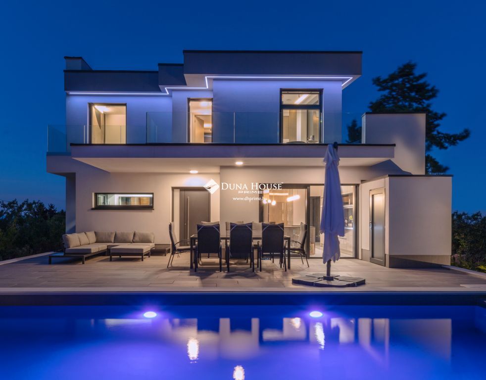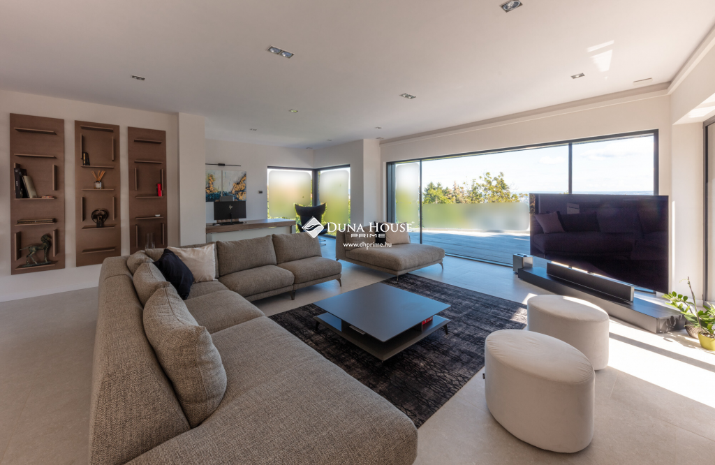 A házat 180 m² teraszfelület öleli körbe, így a beltéri és kültéri élettér szinte egybeolvad. A panoráma pedig minden ablakból és pontból lenyűgöző.