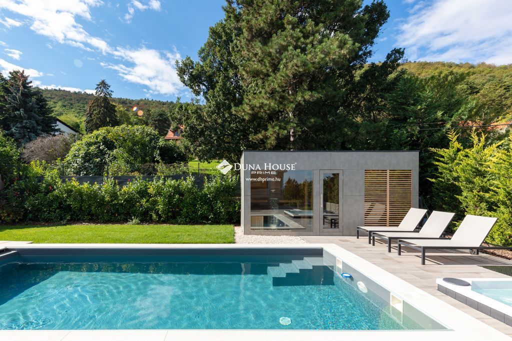 A gondozott, 937 m²-es kertben helyet kapott egy külön szaunaház, egy fűthető-hűthető, 8,3×4 méteres medence, valamint egy jakuzzi minden adott tehát a teljes relaxációhoz. A dupla garázs két nagy méretű autó befogadására alkalmas, és további három autónak is van hely a telken belül.