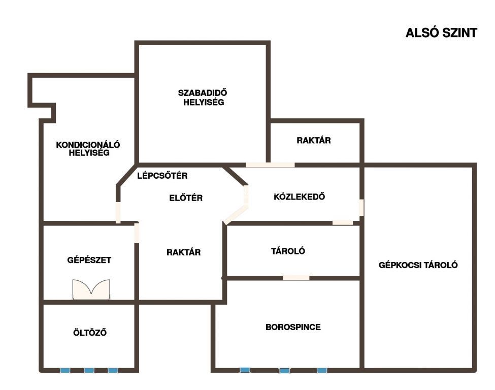 * Alsó szint: a kikapcsolódás szintje – fitneszterem, mozi, borospince, szauna, tárolók és a gépészeti helyiség mellett külön gondnoki lakrész és garázs kapott helyet.