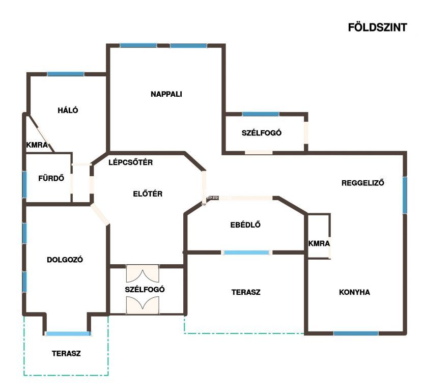 * Földszint: reprezentatív előtér, nagyvonalú nappali panorámás teraszkapcsolattal, dolgozószoba, hálószoba gardróbbal és saját fürdővel, továbbá konyha-étkező, amelyet külön reggelizőterasz egészít ki.