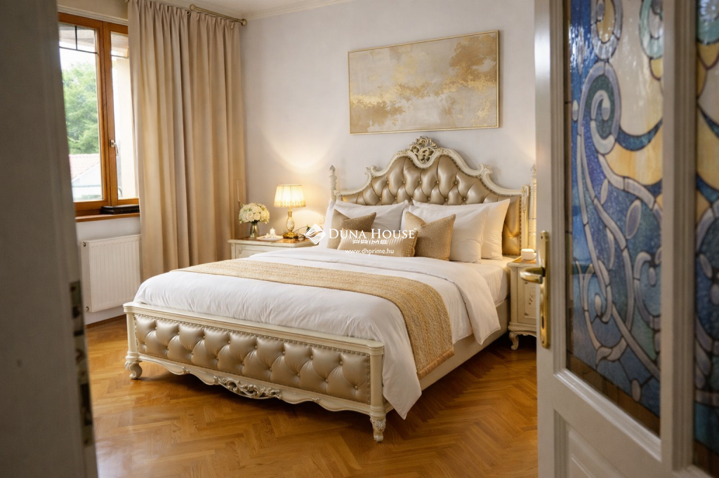 A nappali + 7 szobás, téglaépítésű családi ház egy 1242 m²-es, parkosított telken helyezkedik el. A belső tereket bőséges természetes fény tölti meg, amely a redőnyökkel felszerelt, hőszigetelt fa nyílászárókon keresztül áramlik be. Az otthon kialakításánál a funkcionalitás és az elegancia harmonikus egységet alkot: a szobák minőségi burkolatai, a tömörfa konyhabútor, valamint a beépített gépesítés mind ezt a színvonalat tükrözik.