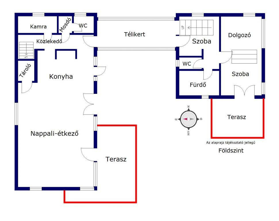 A 737 m²-es, gondosan parkosított kert közepén álló épület nappali + 4 szobás, három fürdőszobával, több külön WC-vel és több terasszal rendelkezik.