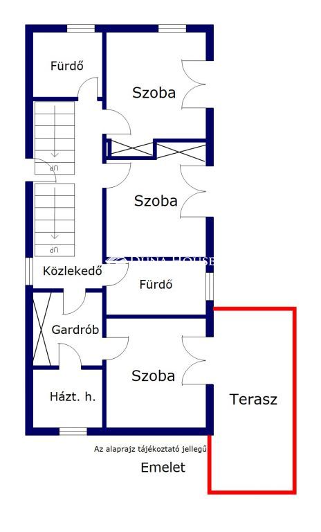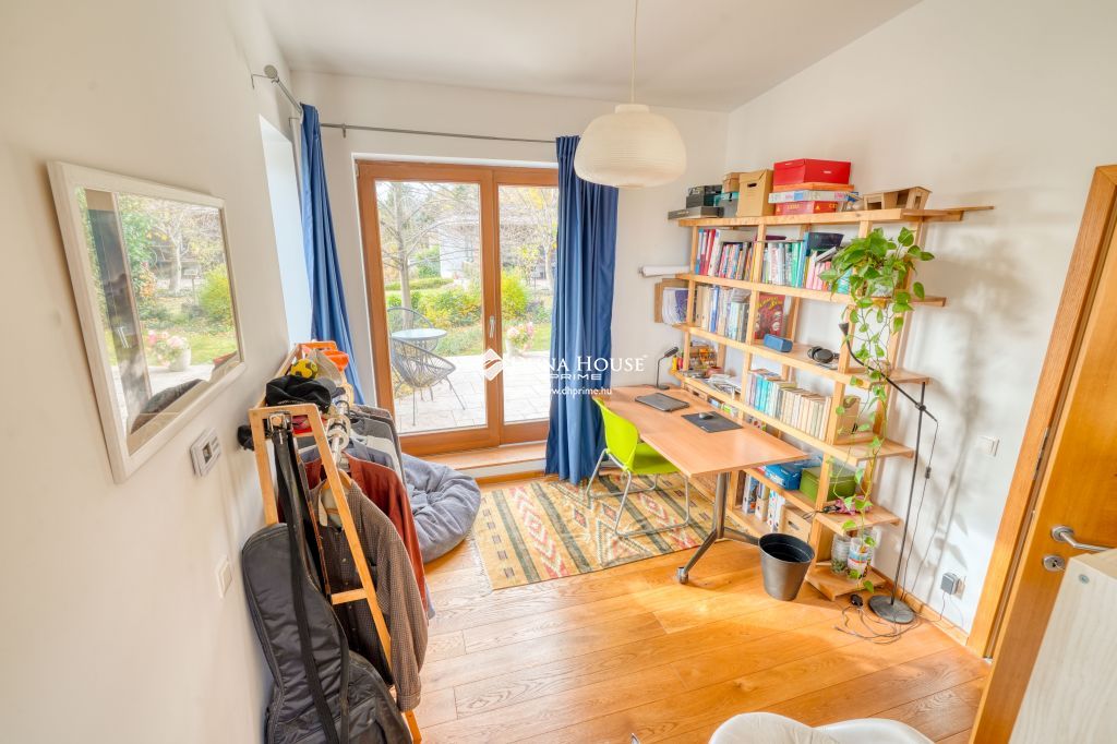 Az emeleten három hálószoba, két fürdőszoba, gardrób és háztartási helyiség található, a fő hálóból közvetlen kapcsolat nyílik egy panorámás tetőteraszra.