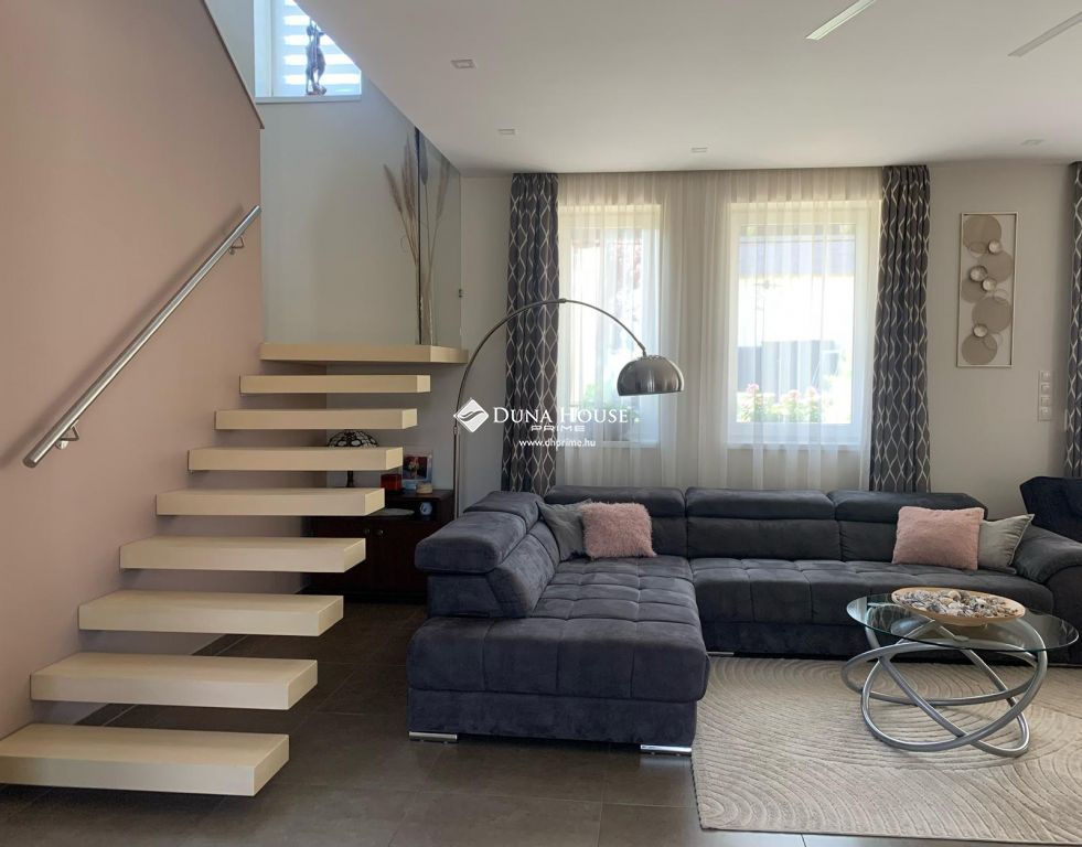 A nappali egyik éke a lebegő lépcső, amely látványosan vezeti fel az emeletre. A felső szint igény esetén tolóajtóval teljesen leválasztható — ideális hangszigeteléshez, illetve a fűtött terek optimalizálásához.