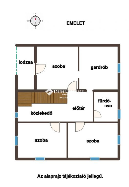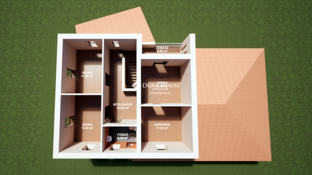 A felső szinten 3 db 12 nm-es szoba, fürdőszoba wc-vel és egy 12 nm-es gardrób szoba található. Utóbbiban kapott helyet az új gázkazán, továbbá egy infra szauna is.