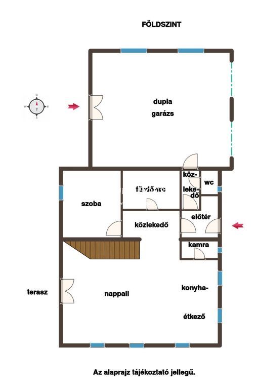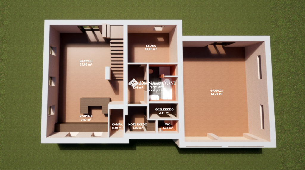 Az alsó szinten található az amerikai konyhás nappali-étkező, fürdőszoba wc-vel, + külön wc, és egy 10 nm-es szoba. A nappaliból 40 nm-es, kertkapcsolatos terasz nyílik a hátsó udvarrész felé.