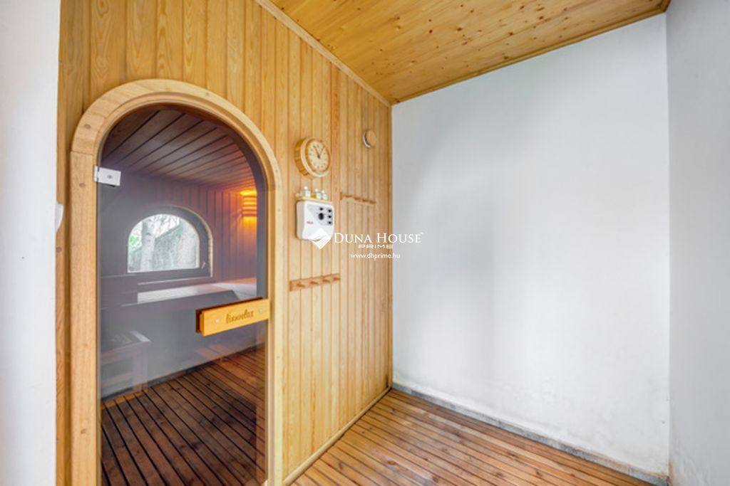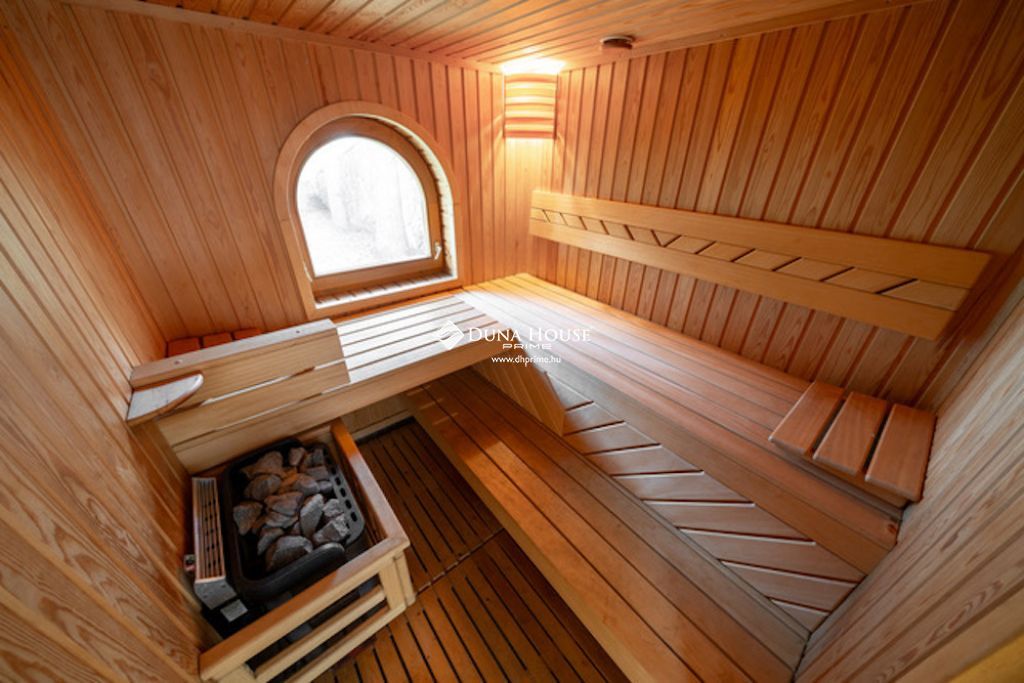 A szépen gondozott kertben borospince, szauna és kerti tároló is helyet kapott, a kényelmet pedig négy gépkocsi számára kialakított parkolóhely egészíti ki.