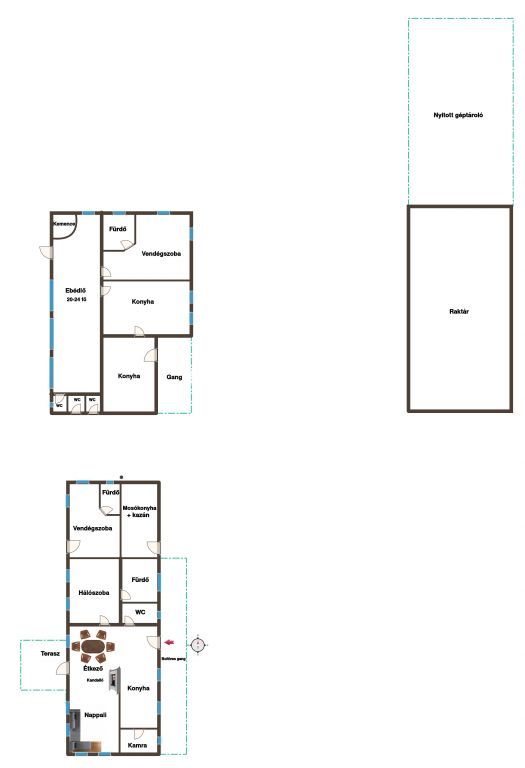 Főépület: napfényes nappali-étkező, fedett teraszok, hálók és vendégszoba saját fürdővel, mosókonyha kazánház.