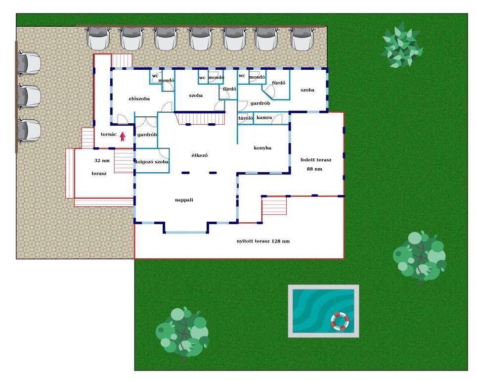 -1. szintjén található a 77 nm-es garázs, valamint az előkertben további tíz parkolóhely várja az autókat.
