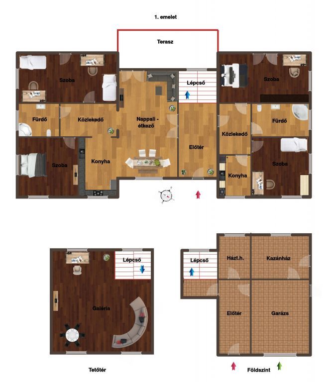 A Dél–nyugati fekvésű teraszról páratlan kilátás nyílik, a kertben örökzöldek és gyümölcsfák teremtik meg a természetközeli hangulatot. A ház elrendezése révén családi otthonként, kétgenerációs házként vagy vendégházként is tökéletes választás.