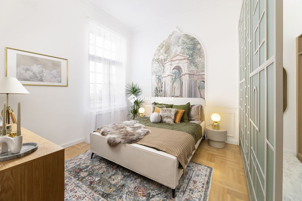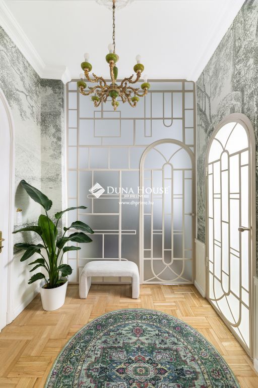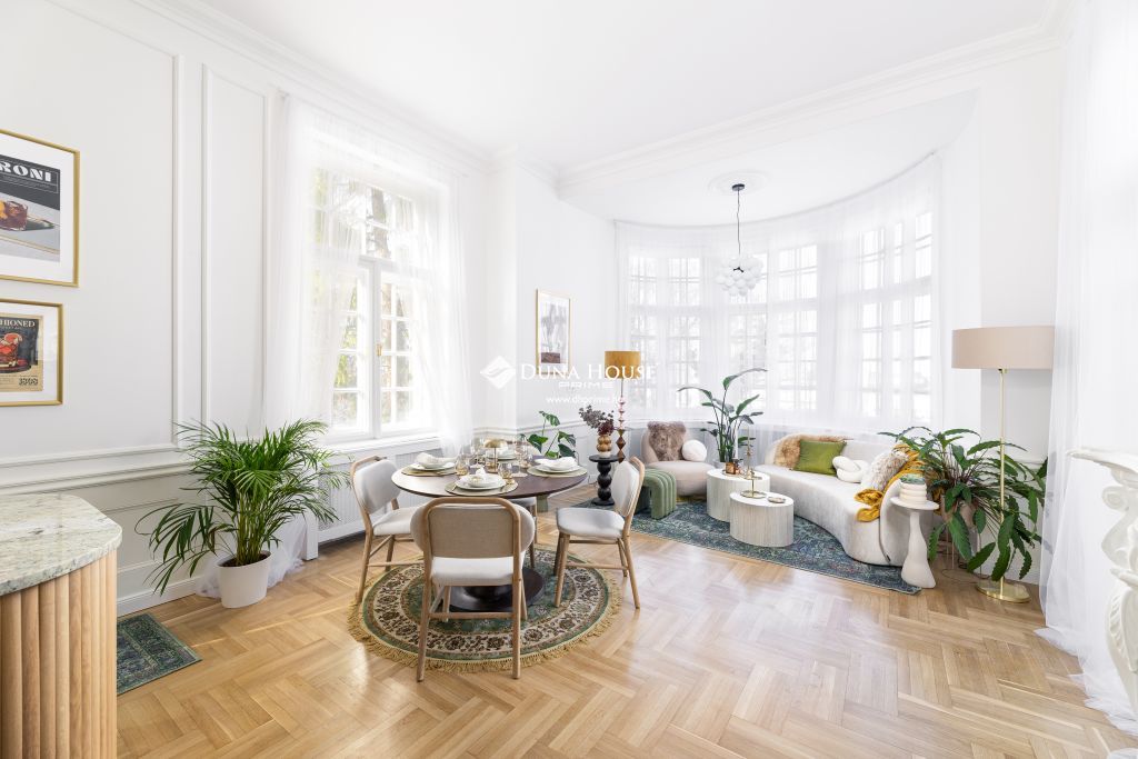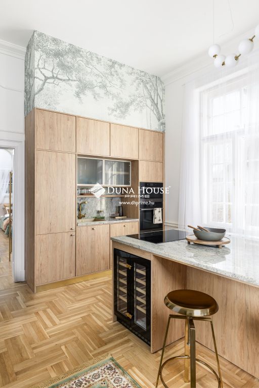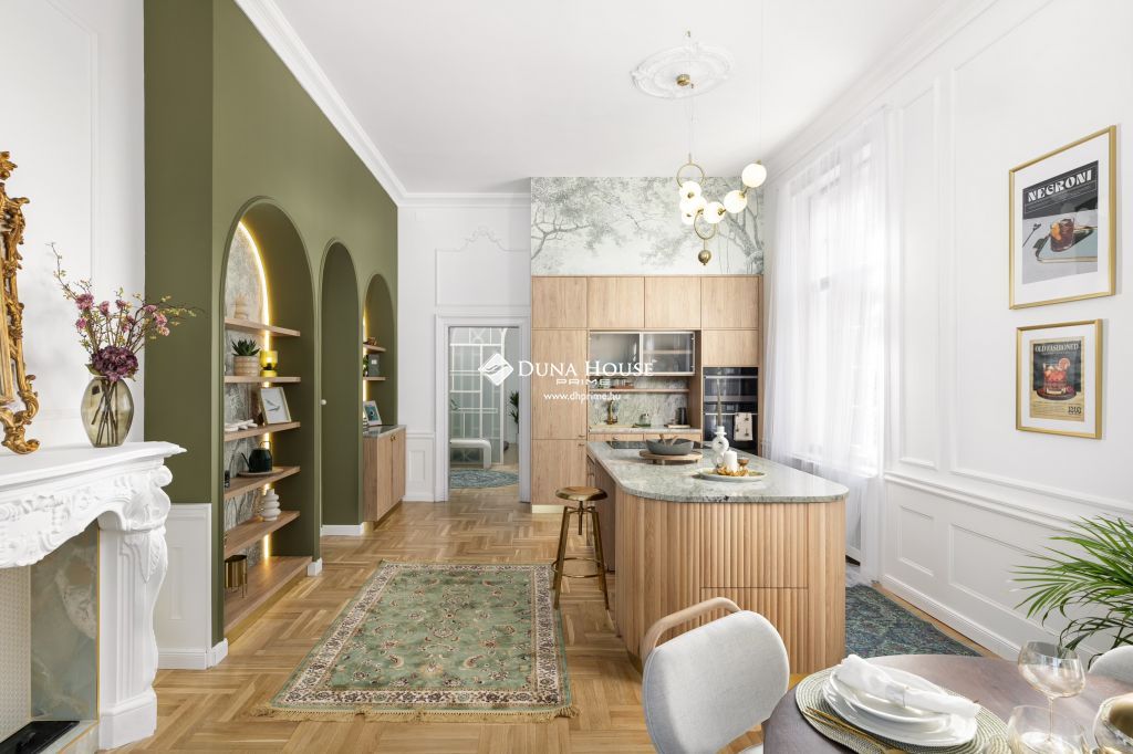 A 93 m² alapterületű lakás nappali + 2 hálószobás elrendezésű, két teljes értékű fürdőszobával rendelkezik, és nemrégiben esett át egy átgondolt, elegáns stílusú felújításon. A lakás a hajdani villa legreprezentatívabb helyiségeiben kapott helyet, amely azonnal érezhető a tágas terekben és a kiemelkedő, 365 cm-es belmagasságban.
