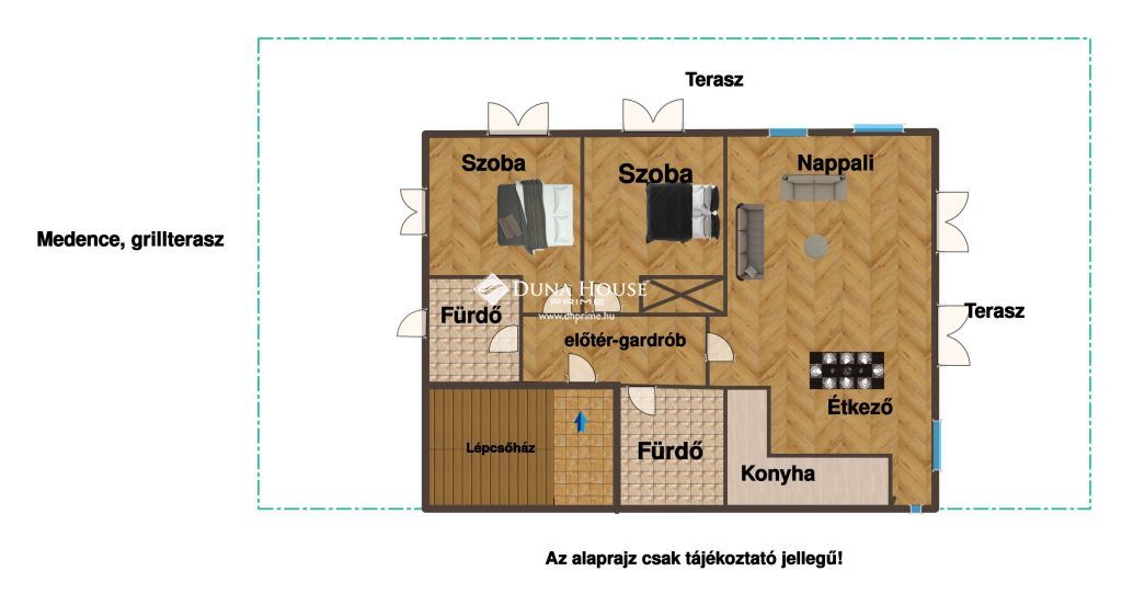 Amerikai nappali + 2 háló + 2 fürdőből álló lakás lenyűgöző panorámával, 80 nm-es terasszal (negyedelve beszámítva) igazán vonzó lehet egy kisebb család vagy párok számára, legény vagy leánylakásnak. Fentieken kívül medencével, grill-terasszal is rendelkezik a ház.