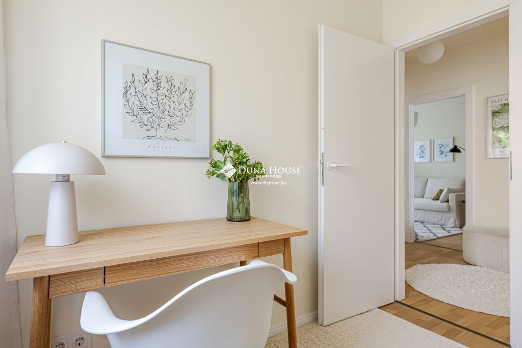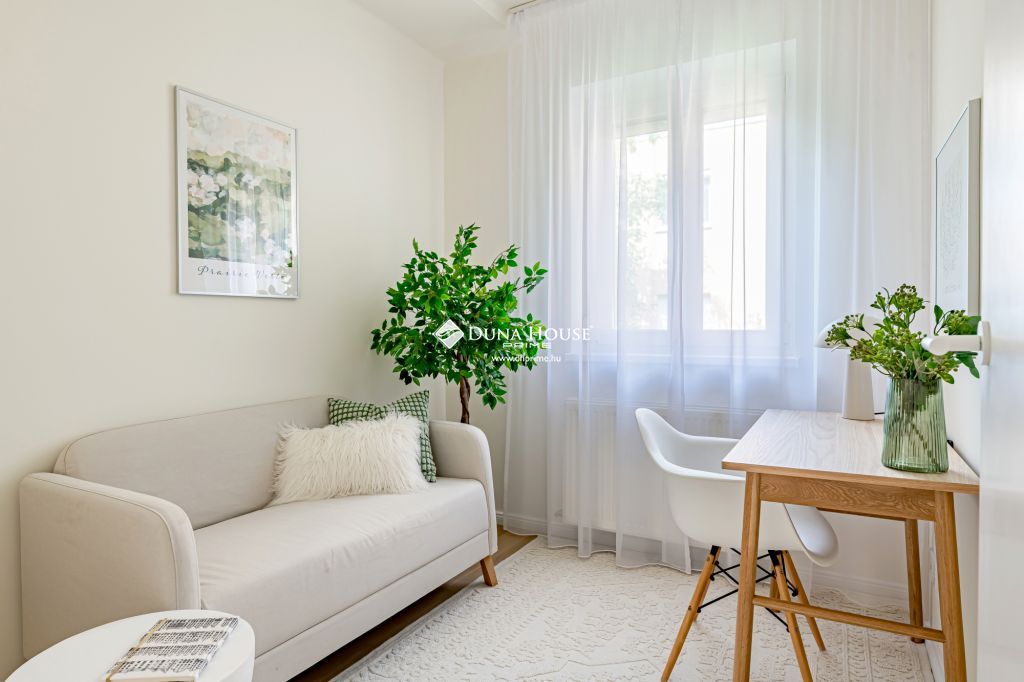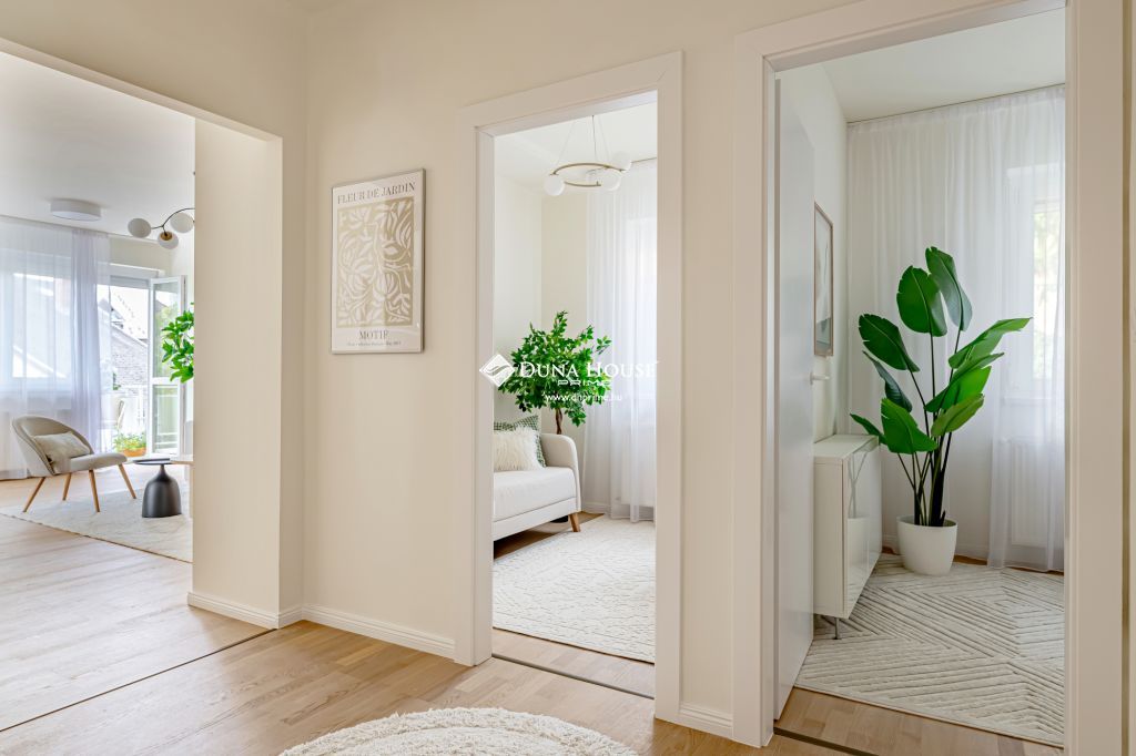 A nappali tágas, világos, zöldre néző ablakokkal és panorámás erkéllyel. A három különnyíló szoba csendes, kertre néz, egyikükhöz egy nagy, árnyékos erkély is tartozik. A lakás elrendezése kiváló, minden helyiség kényelmesen használható.