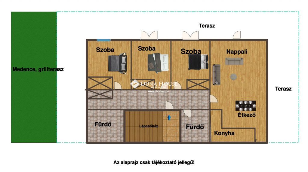 Az amerikai nappali + 3 háló + 2 fürdőből álló ingatlan lenyűgöző panorámával, 69 nm-es terasszal (harmadolva beszámítva) igazán vonzó lehet családok vagy párok számára. Fentieken kívül tágas teremgarázzsal és medencével, grill-terasszal is rendelkezik a ház.