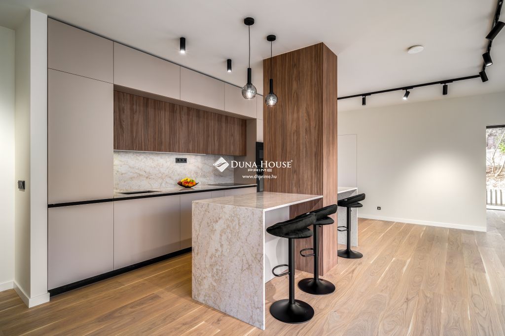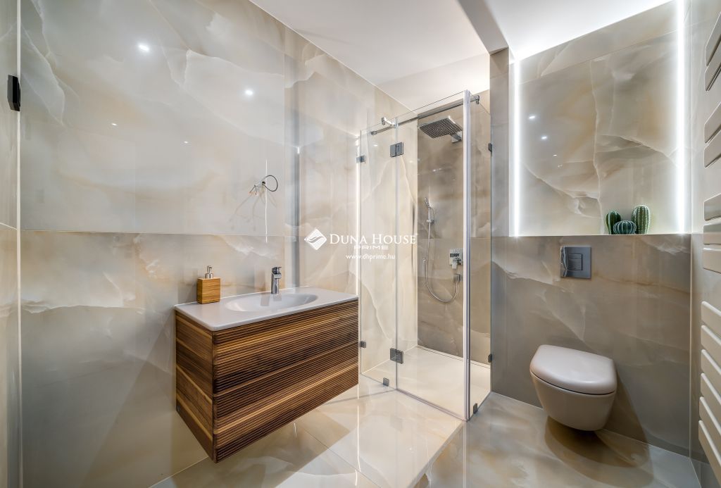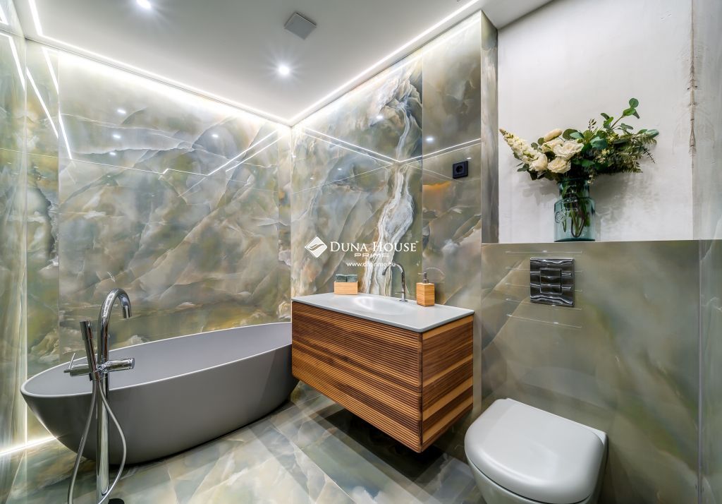 Magas minőségű burkolatok és szaniterek kerületek beépítésre, az elegáns, letisztult beépített konyhabútor Miele gépekkel felszerelt.