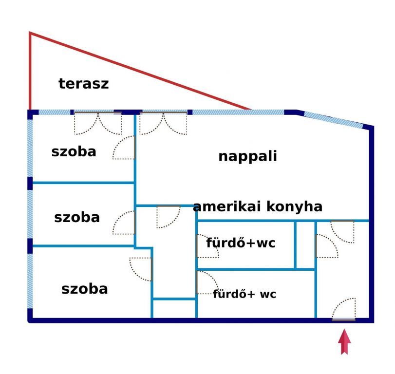 Az ingatlan kiváló elrendezésének köszönhetően nappali + 3 halószobával rendelkezik, melyből mindhárom külön bejáratú, 12 nm-es terasz, 2 fürdőszoba, gardrób és egy külön toalett biztosítja a komfortérzést.