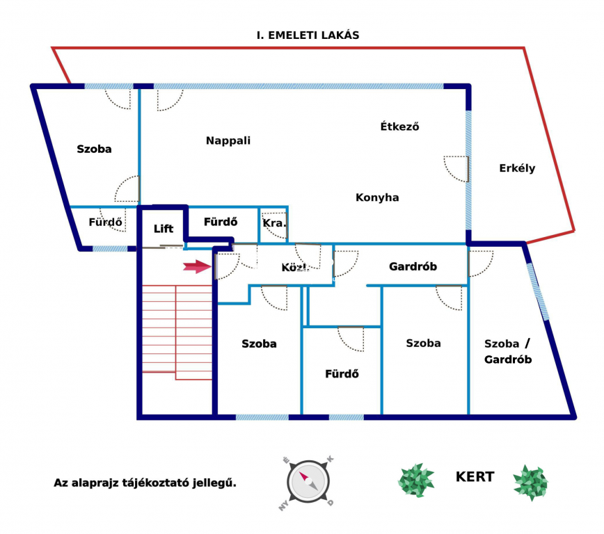 A közel 1500 m²-es telken megépült épületet egy neves építész tervezte, amelynek letisztult formavilága és harmonikus elrendezése tökéletes összhangban van a környék csendes, zöld környezetével. A lakás ÉK tájolású, így a terek egész nap világosak, a természet közelsége pedig minden helyiségből érezhető.