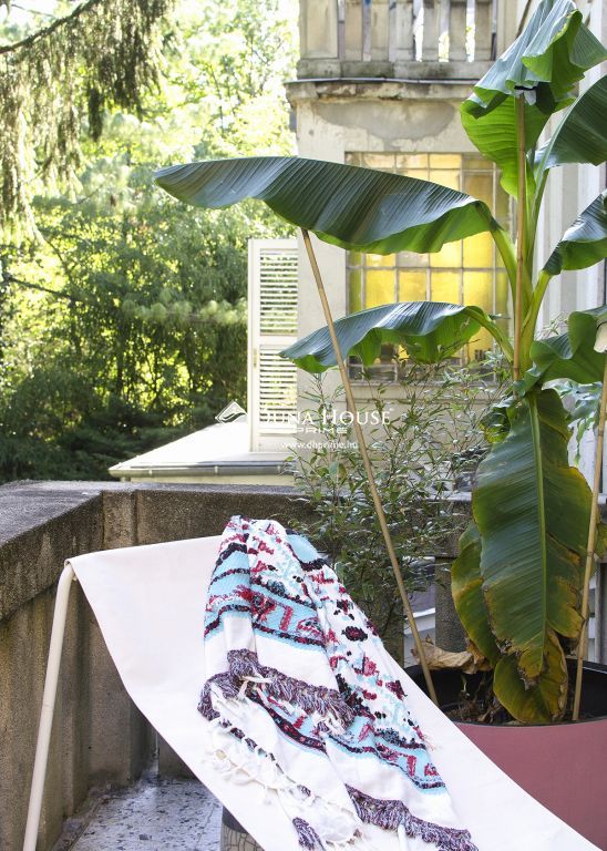 A műterem jellegű villa különleges atmoszférája és a lakást övező környezet egyaránt a nyugalmat szolgálják: a napfényben úszó terasz és a lakás ablakai a ház hátsó, örökzöldekkel gazdagon beültetett kertre néznek, teljes csendben, a forgalom zaja nélkül.