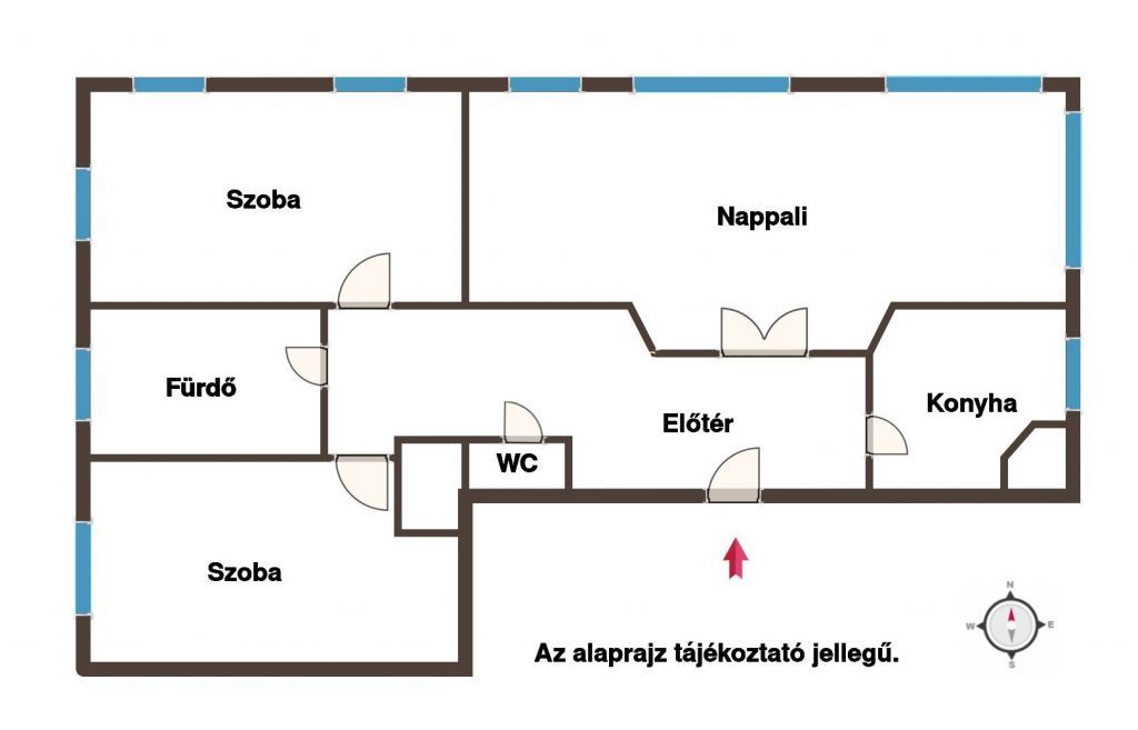 A közel 100 m²-es alapterület a 8 nm-es terasszal kiegészítve praktikus helyiségkapcsolatokkal rendelkezik: két hálószoba, világos nappali, külön konyha, étkező, fürdőszoba, valamint egy külön WC biztosítja a mindennapi kényelmet. ÉK-i tájolása miatt a lakás friss, természetes fényben gazdag.