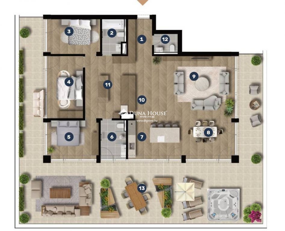 A jelen bemutatott ingatlan is a legfelső szinten helyezkedik el. 157 nm-es lakóteréhez egy közel hasonló méretű terasz is társul. Elosztását tekintve tágas, amerikai konyhás nappali, 3 hálószoba, 2 fürdő és vendégtoalett tartozik hozzá.