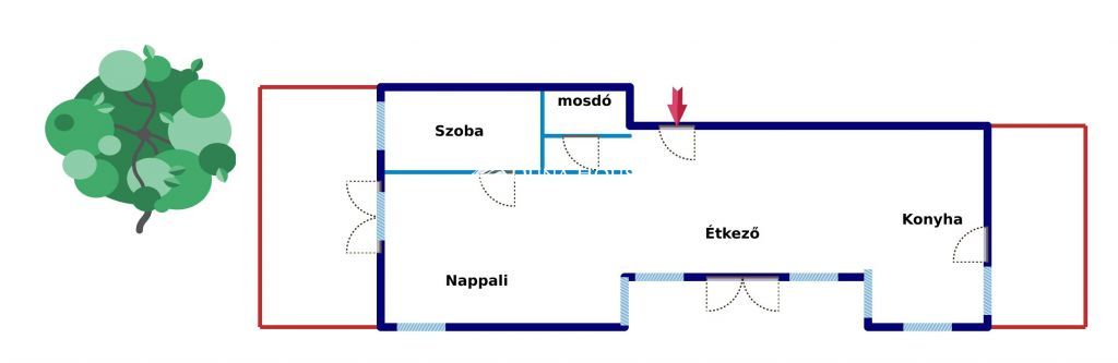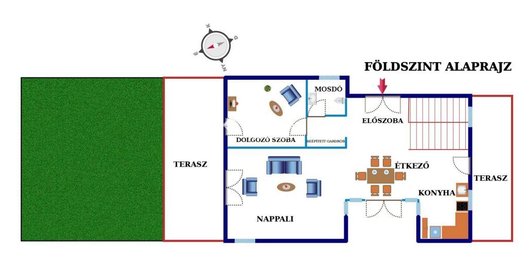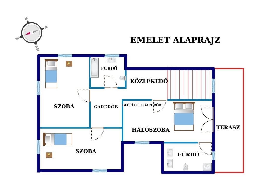 - Földszint: nappali-konyha-étkező, szoba, fürdőszoba, előszoba, gardrób és mosdó