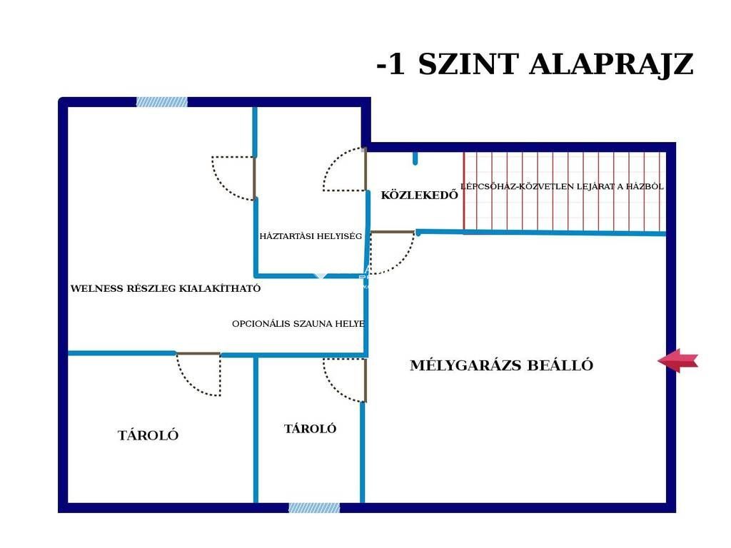 - -1 es szint: fitnesz szoba, gépészet, tároló, 2 autó számára garázs