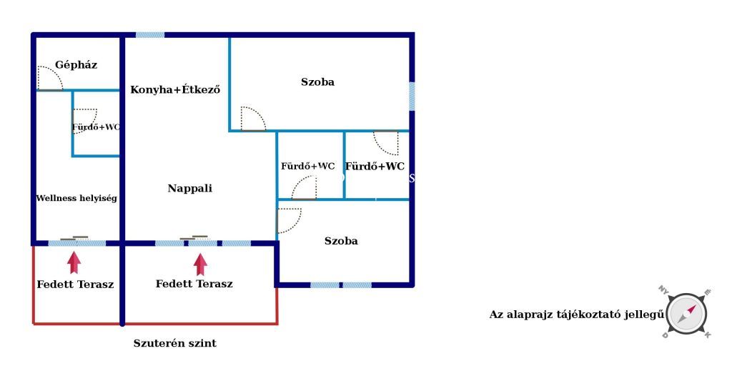 A 92 négyzetméteres szuterén szinten amerikai konyhás nappali, 2 hálószoba, 2 fürdőszoba, valamint egy wellness helyiség került kialakítása. Ezekhez 20 négyzetméteres fedett terasz tartozik.