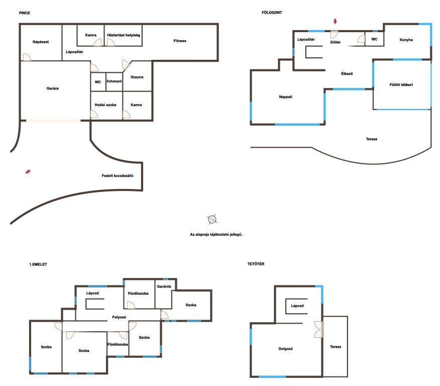 - Alsó szint: dupla garázs, fedett autóbeállók, szauna, háztartási helyiségek és egy teljesen felszerelt edzőterem