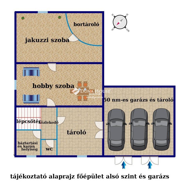 Az alagsorban található a kazán, s a meleg víz solar rendszer, a klubhelyiség, a szerszámos tároló közel 20 négyzetméteren, a borospince, s a 40 négyzetméteres tároló is.