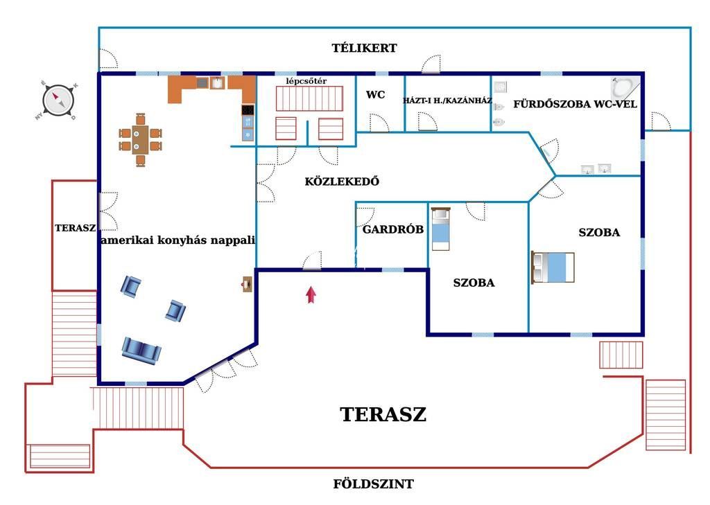 Az épület földszinti része 110 nm-es, mely nappali-konyha-étkező részből, 75 nm-es panorámás teraszból, 2 hálószobából, fürdőszobából, toalettből, háztartási helyiségből és gardróbszobából áll. Érdekessége ennek a szintnek egy hangulatos, 25 nm-es téli kert.