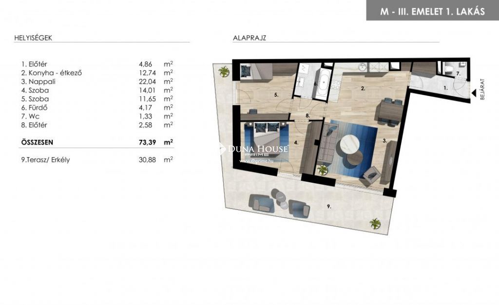 Ez a lakás az 3. emeleten helyezkedik el, 71,77 nm nettó lakóterülettel rendelkezik, tágas nappali, 2 háló, fürdő kapott benne helyet és egy 30,88 nm-es terasz tartozik hozzá.