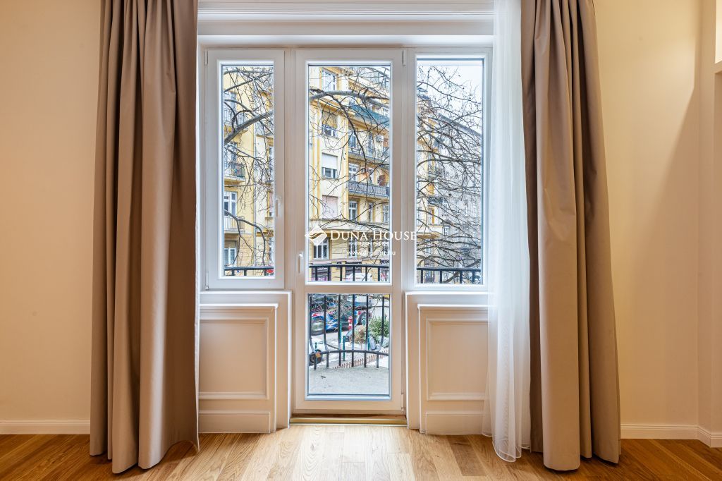 A nagy ablakfelületeknek köszönhetően a lakás kimondottan napfényes, világos egész nap. A felújítás során a nagypolgári elegancia magas belmagasság, arányos terek megmaradt, miközben modern, letisztult megoldások tették igazán komfortossá az otthont.